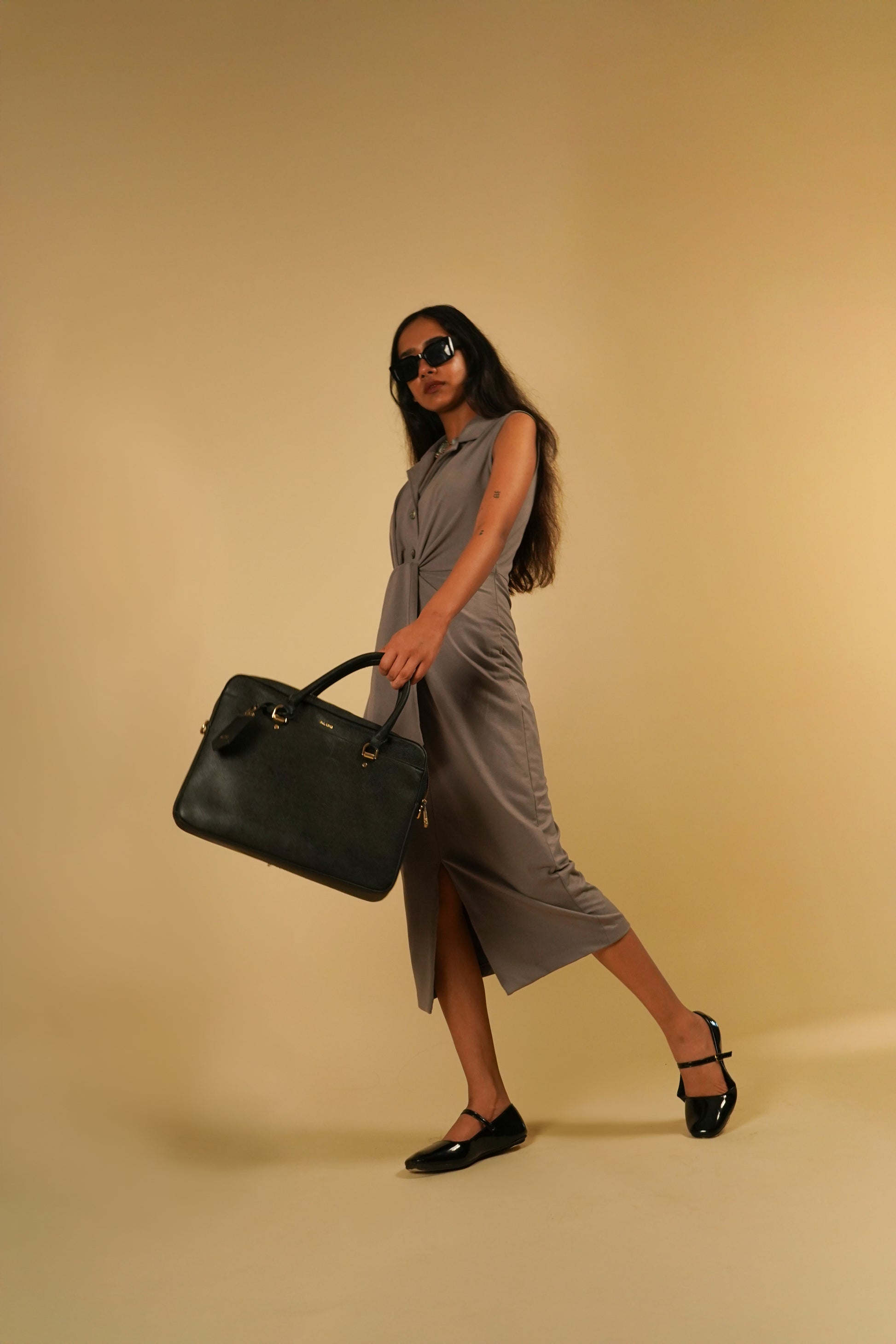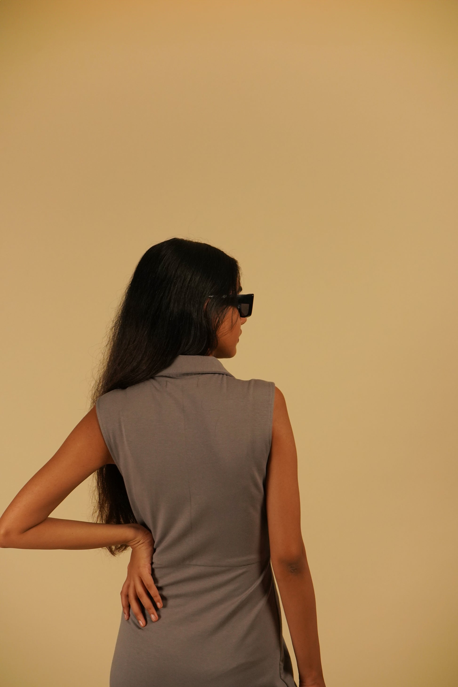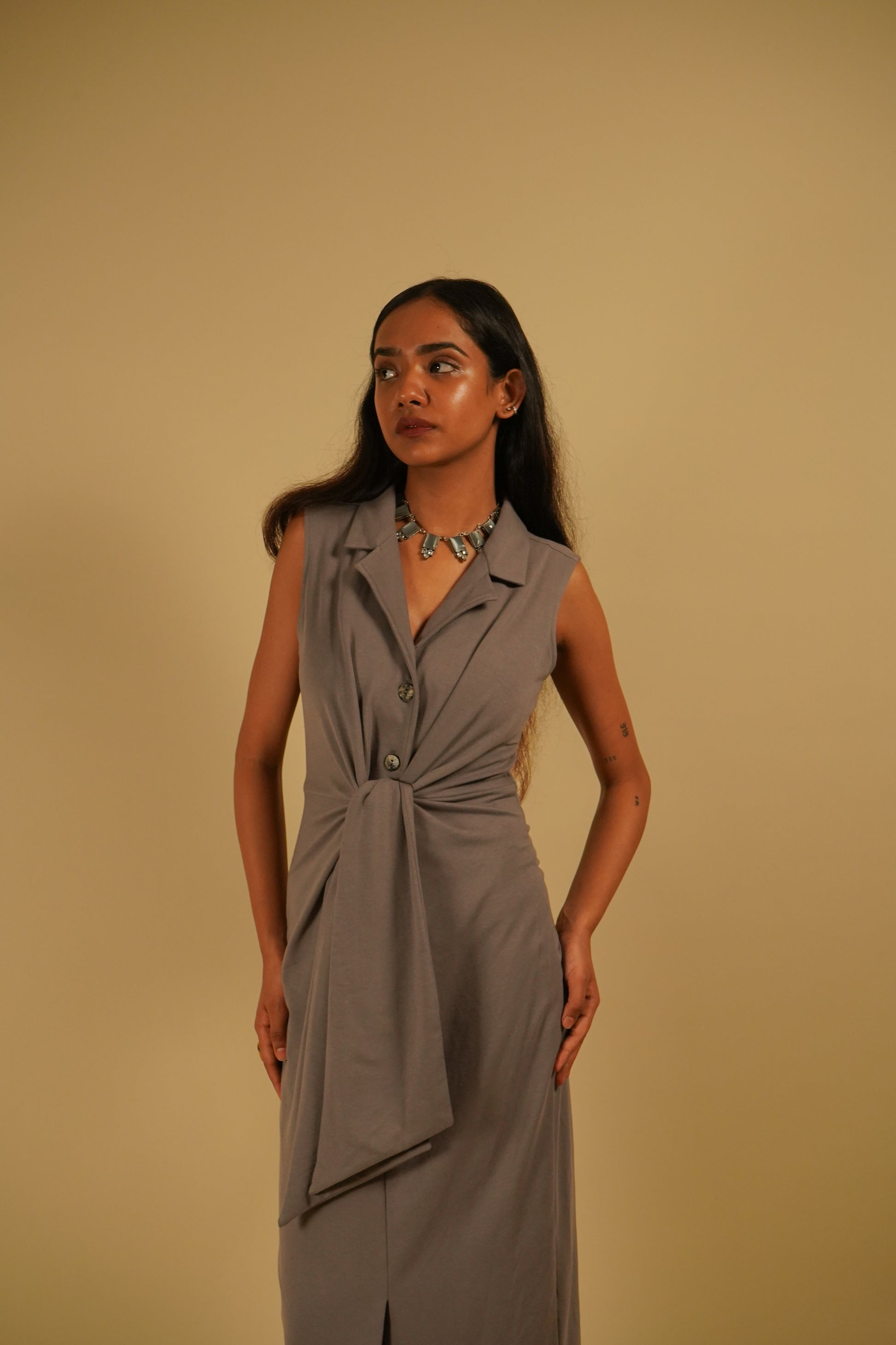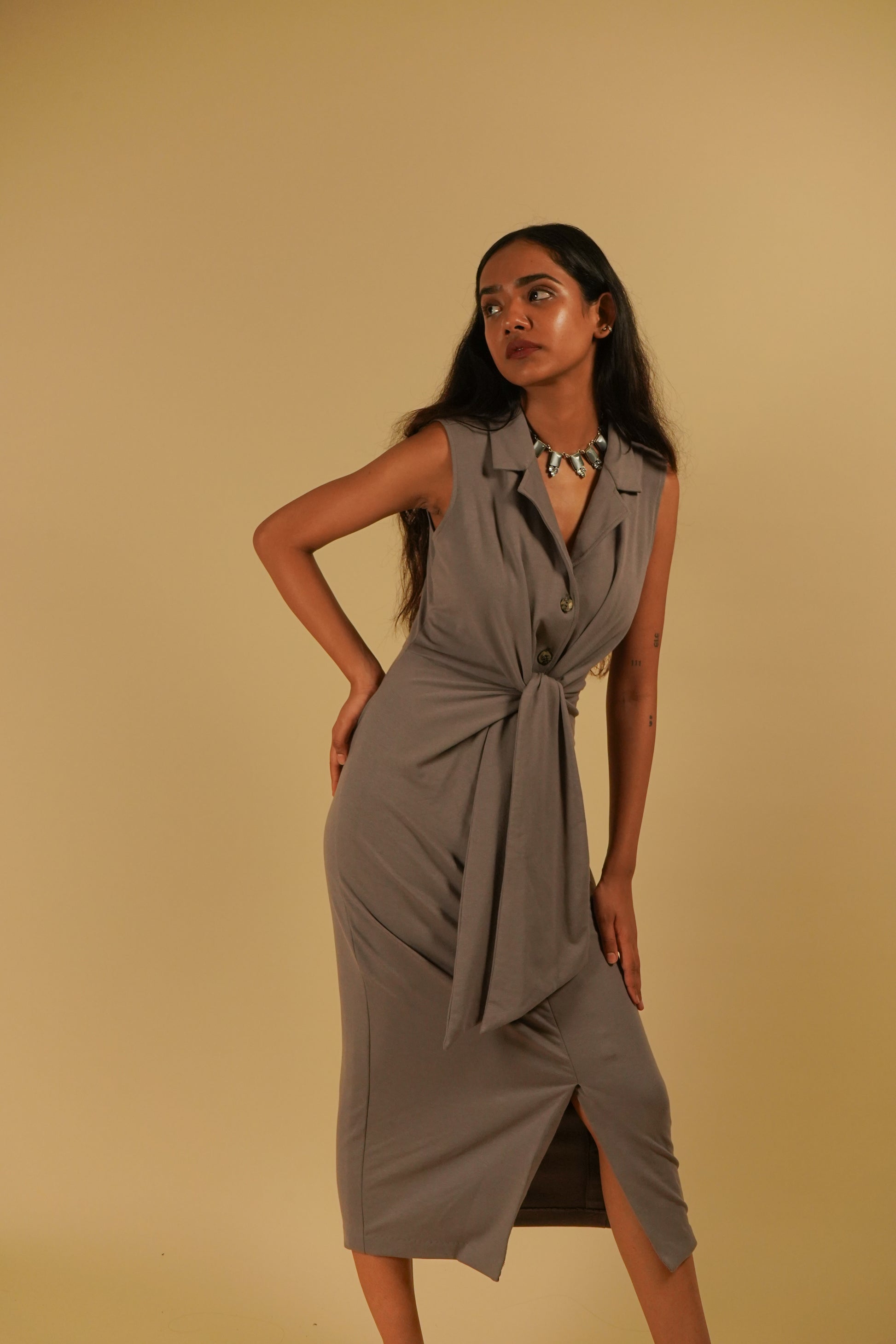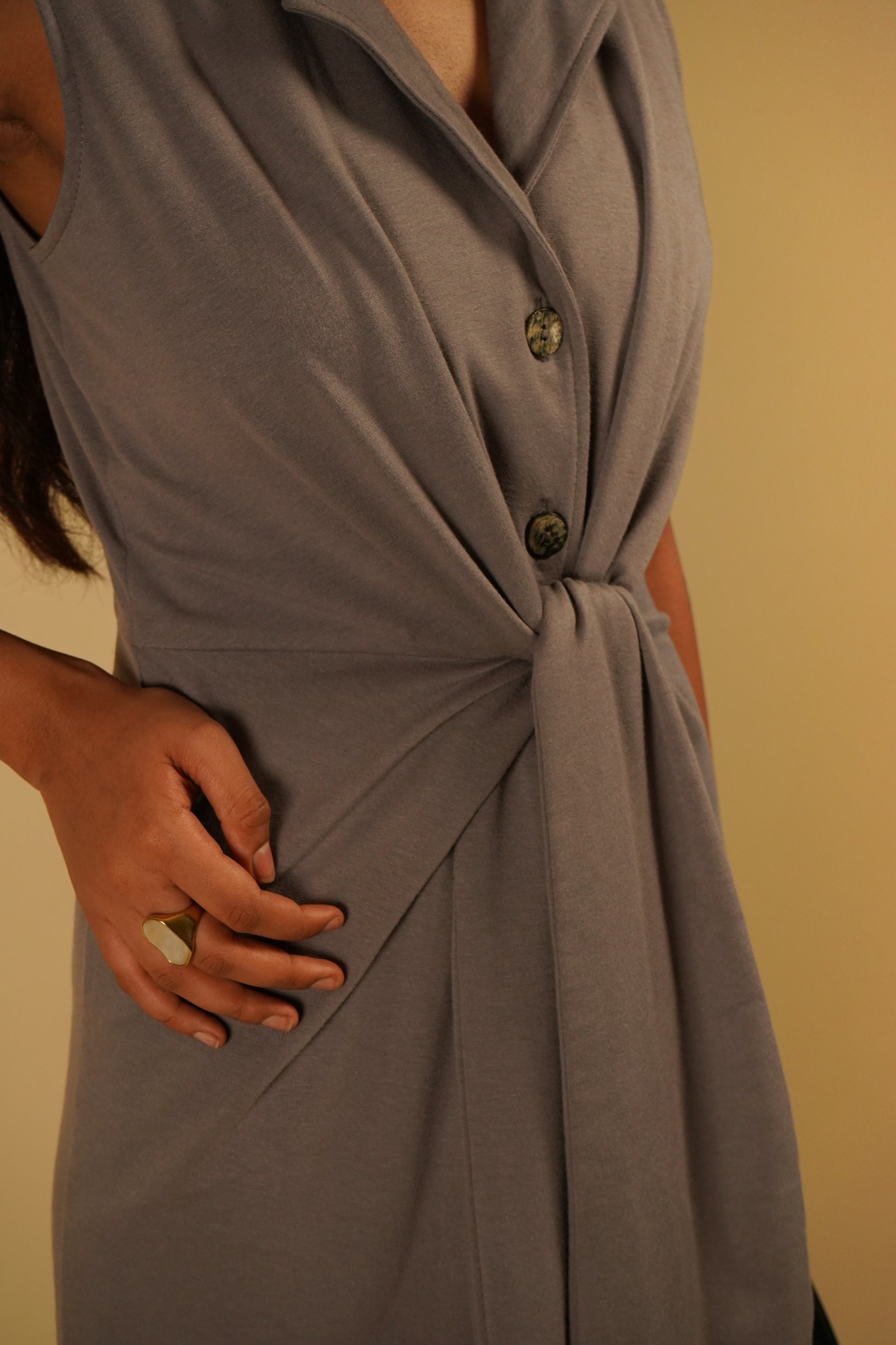 This sleeveless dress, crafted from a bamboo blend stretchable fabric, combines comfort with modern elegance. It features a collared neckline, button-down front, and a front-tie detail that cinches the waist for a flattering silhouette. The soft drape and subtle slit add movement and ease, making it perfect for both work and casual settings.