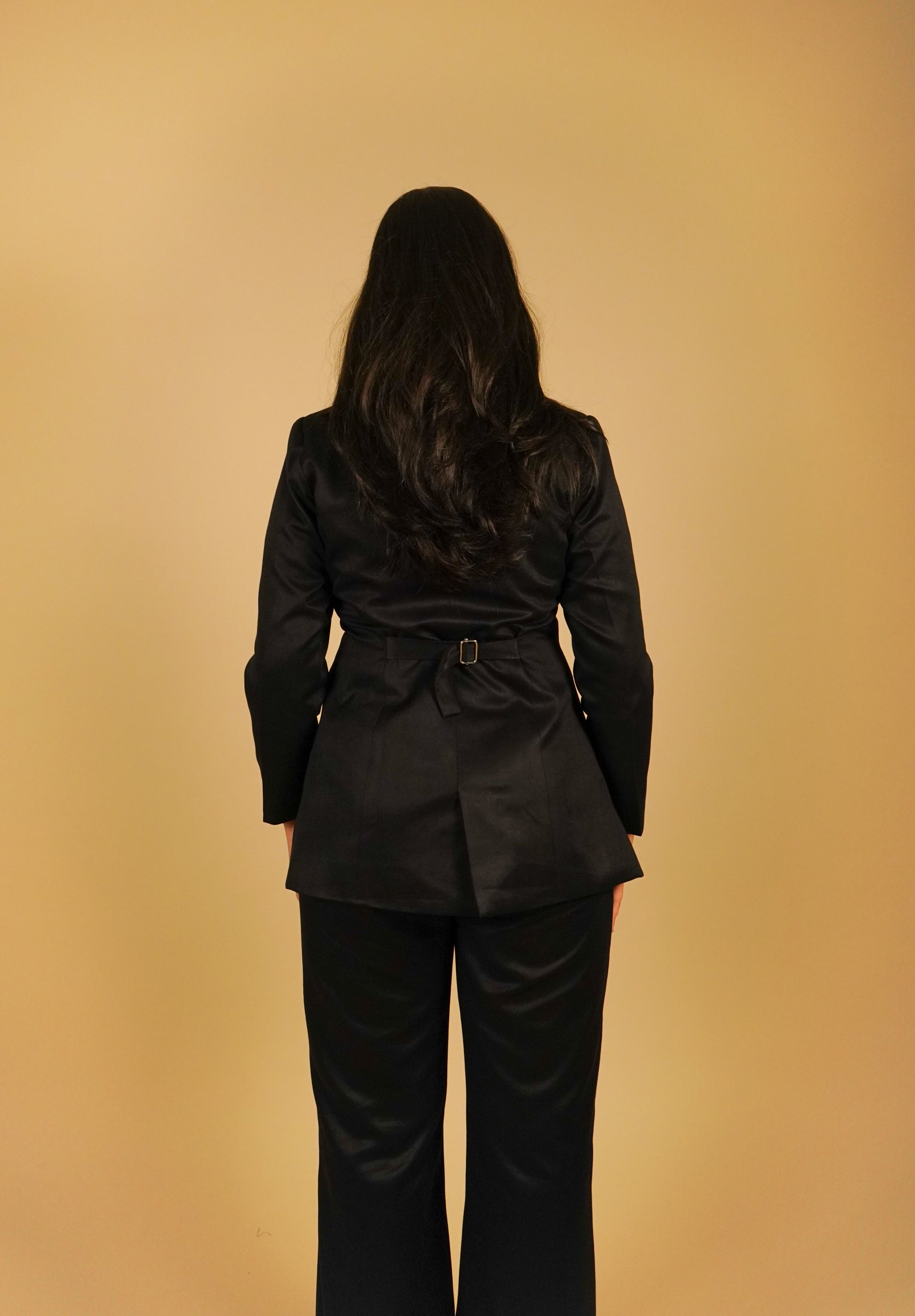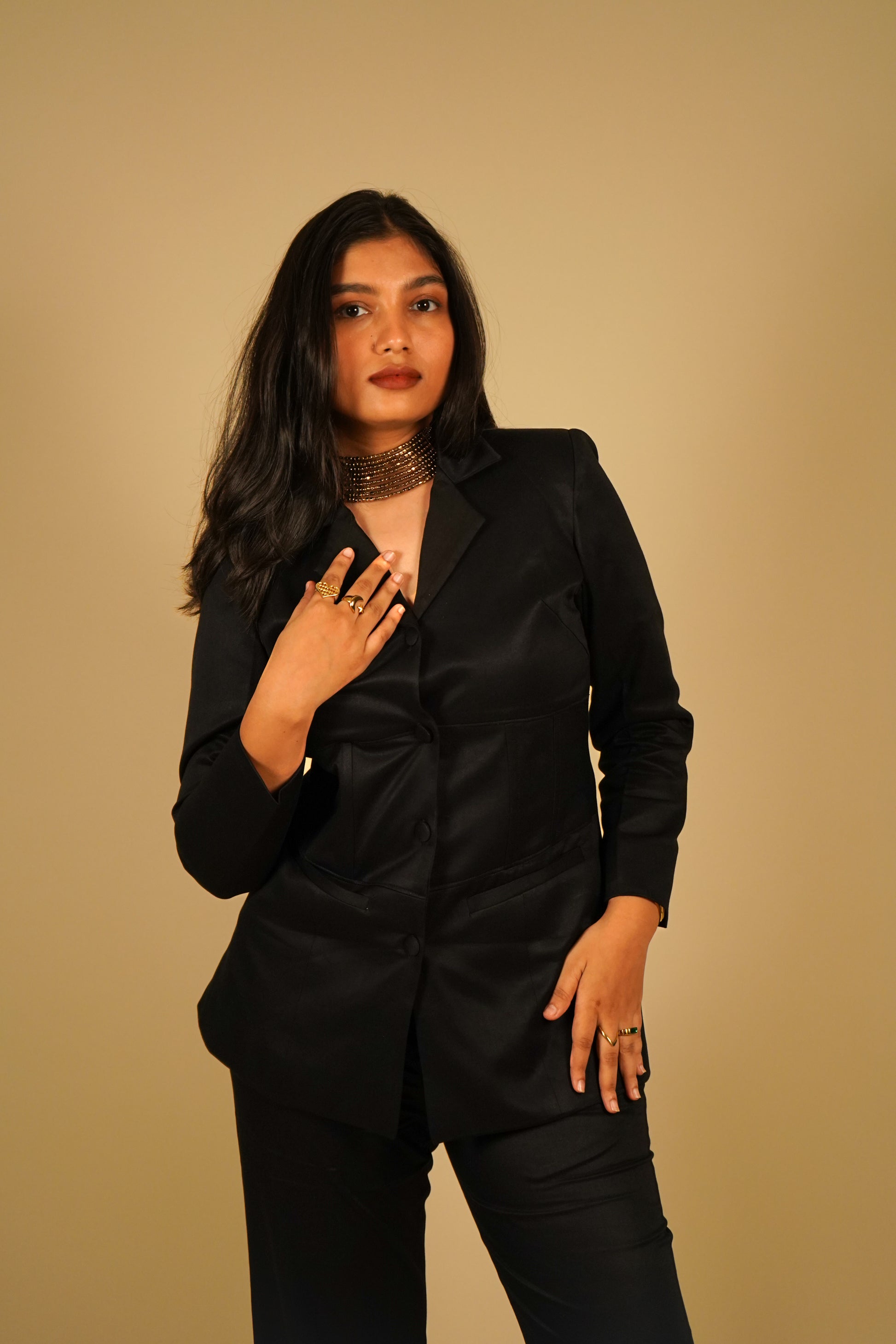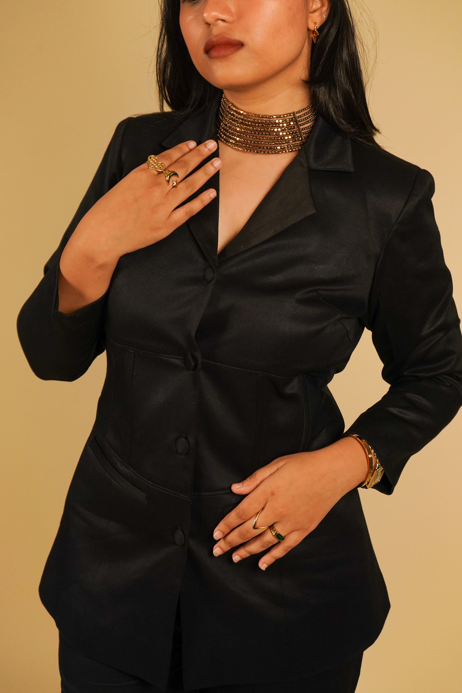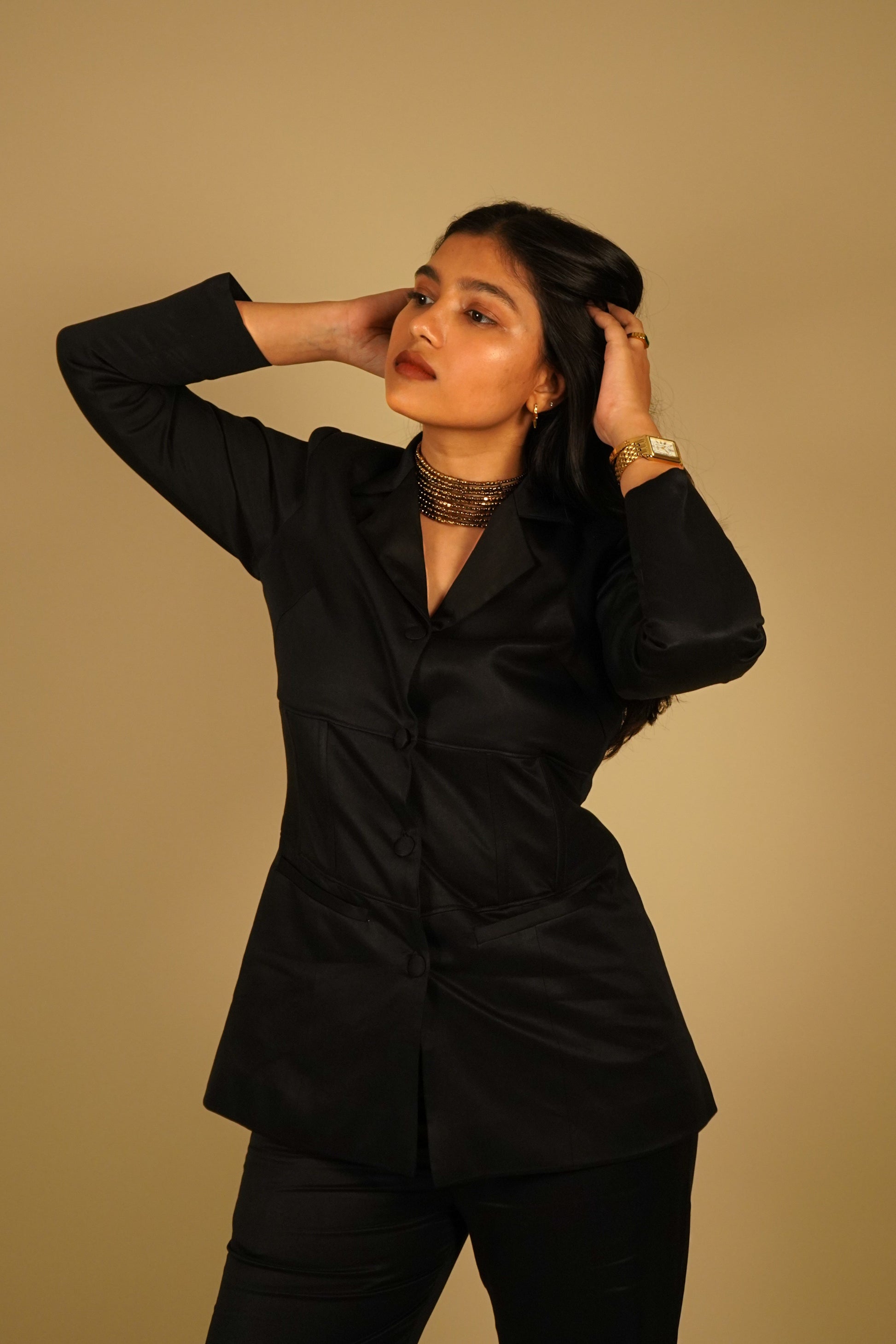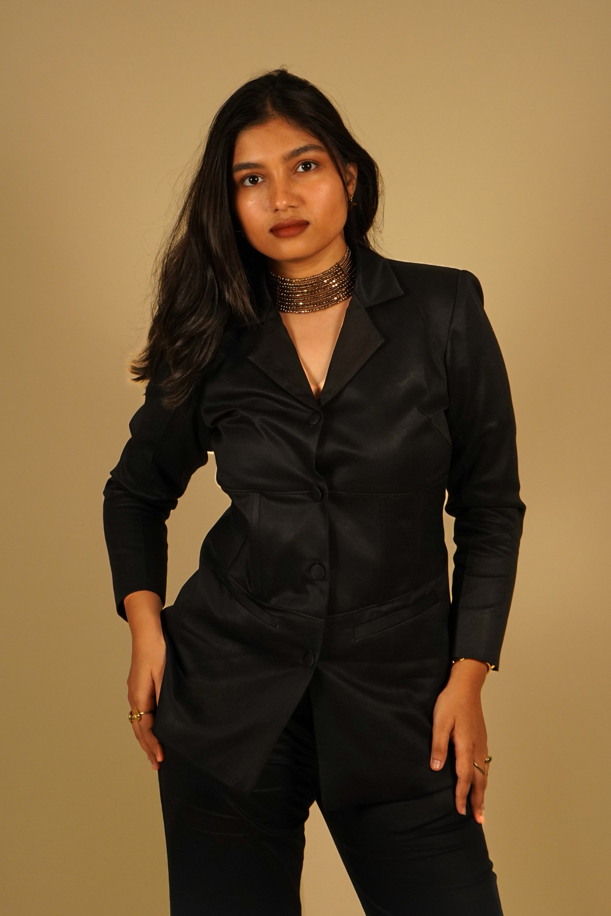Meticulously tailored, this black blazer boasts a structured design with a corset-style waist that creates a flattering, cinched effect. Made from bamboo fabric, it seamlessly blends sustainability with elegance. A striking and versatile piece perfect for a day-to-night look.