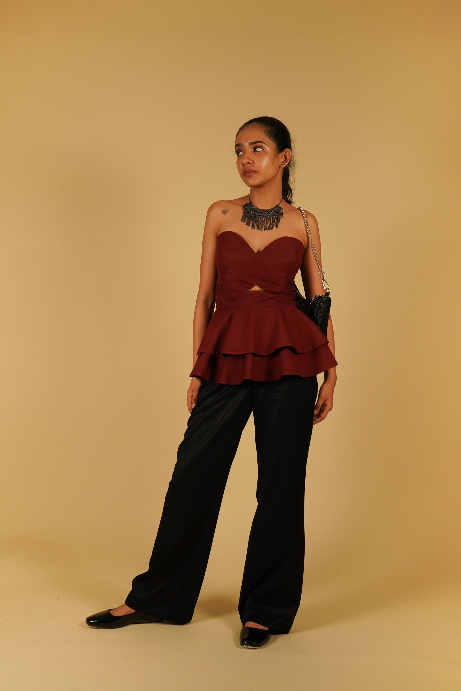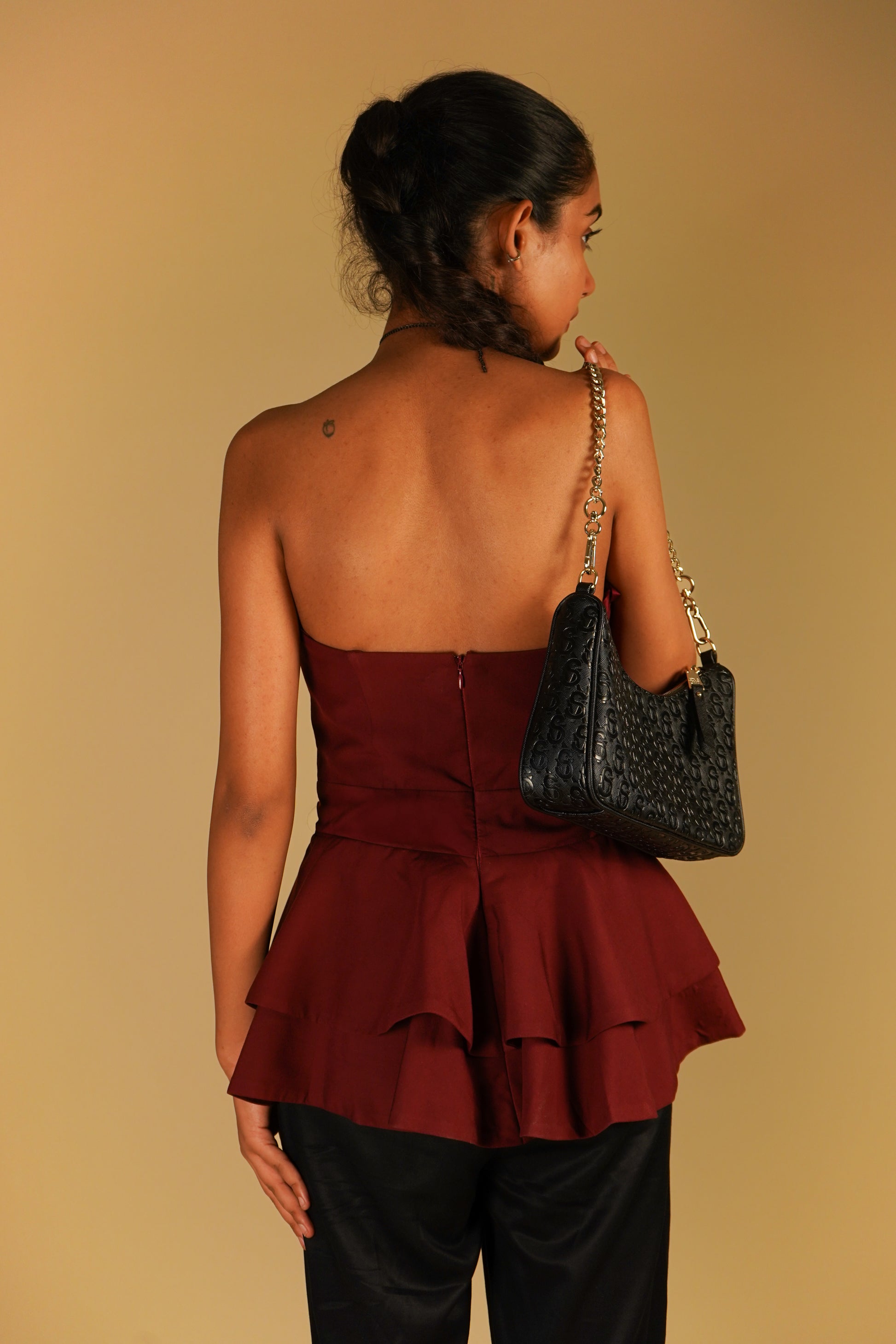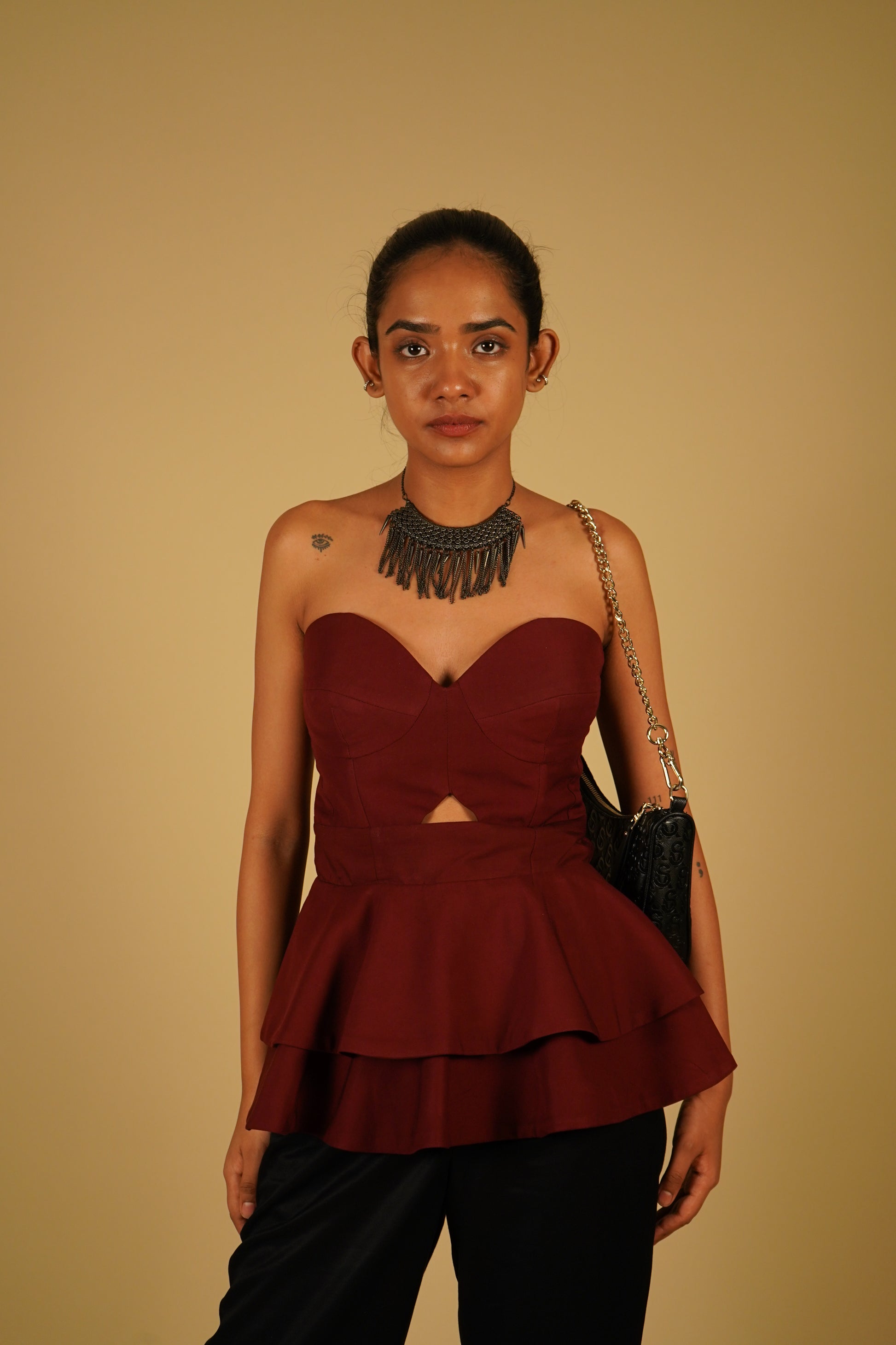 This strapless design features a sweetheart neckline and a bustier bodice for a flattering, sculpted fit with a cut-out at the waist. The waistband defines the silhouette, while the peplum adds a touch of feminine flair. An added strap loop offers versatility, allowing for a customizable fit.
