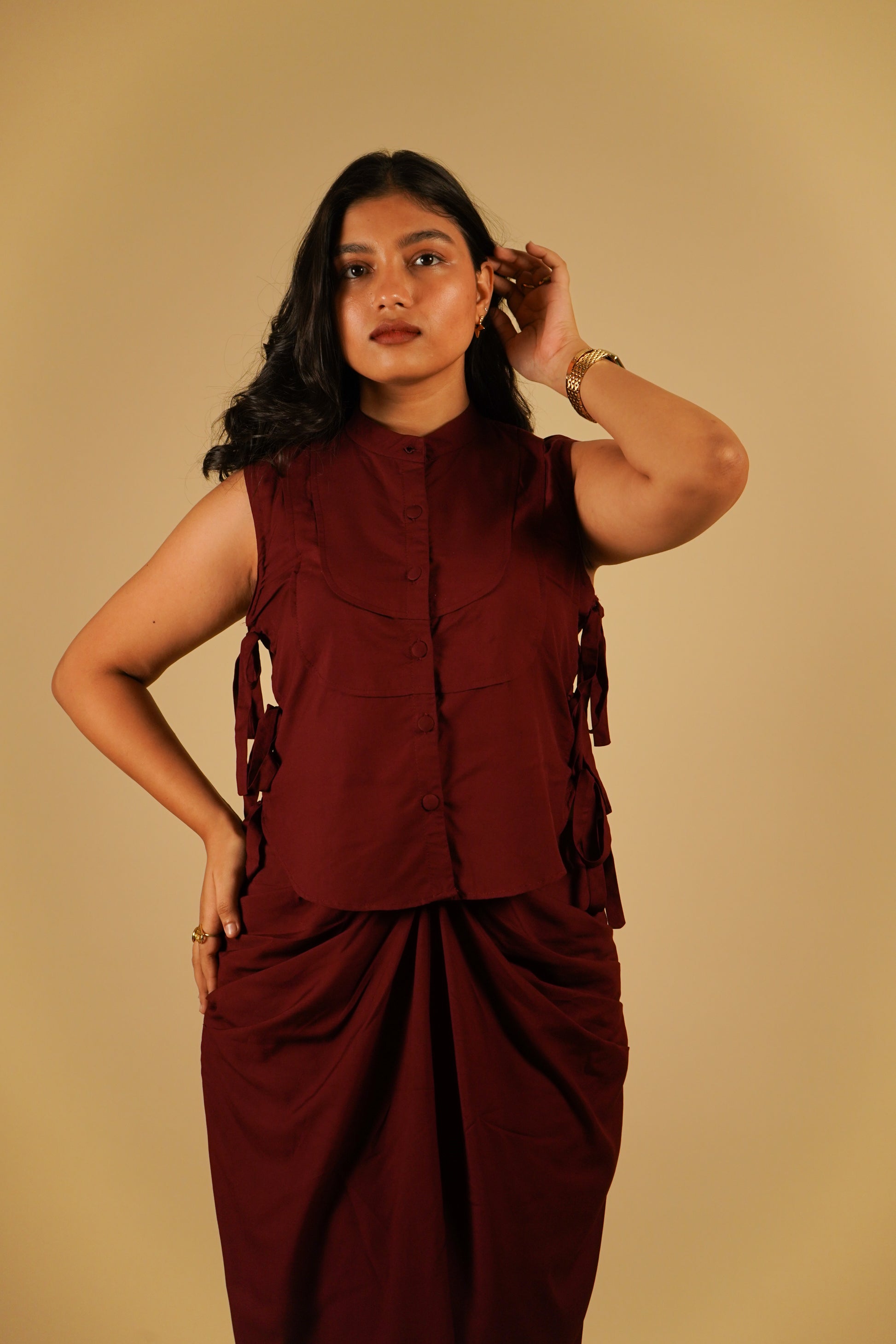 Crafted in breathable bamboo fabric, this sleeveless top feature soft button detailing and a structured front panel. Side tie-ups add a playful touch while allowing for a customizable fit. Perfect to pair with tailored pants or casual bottoms for versatile styling.