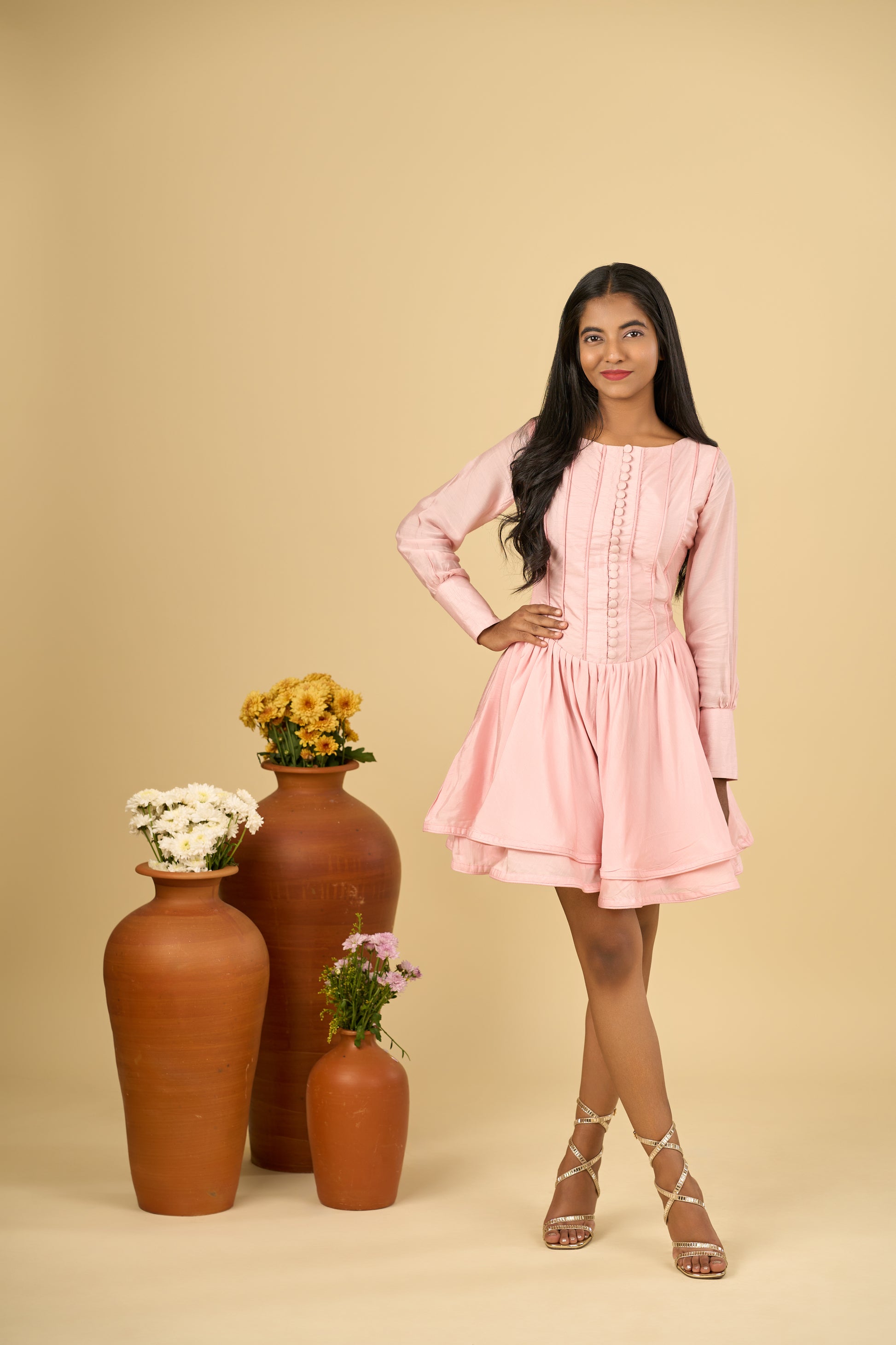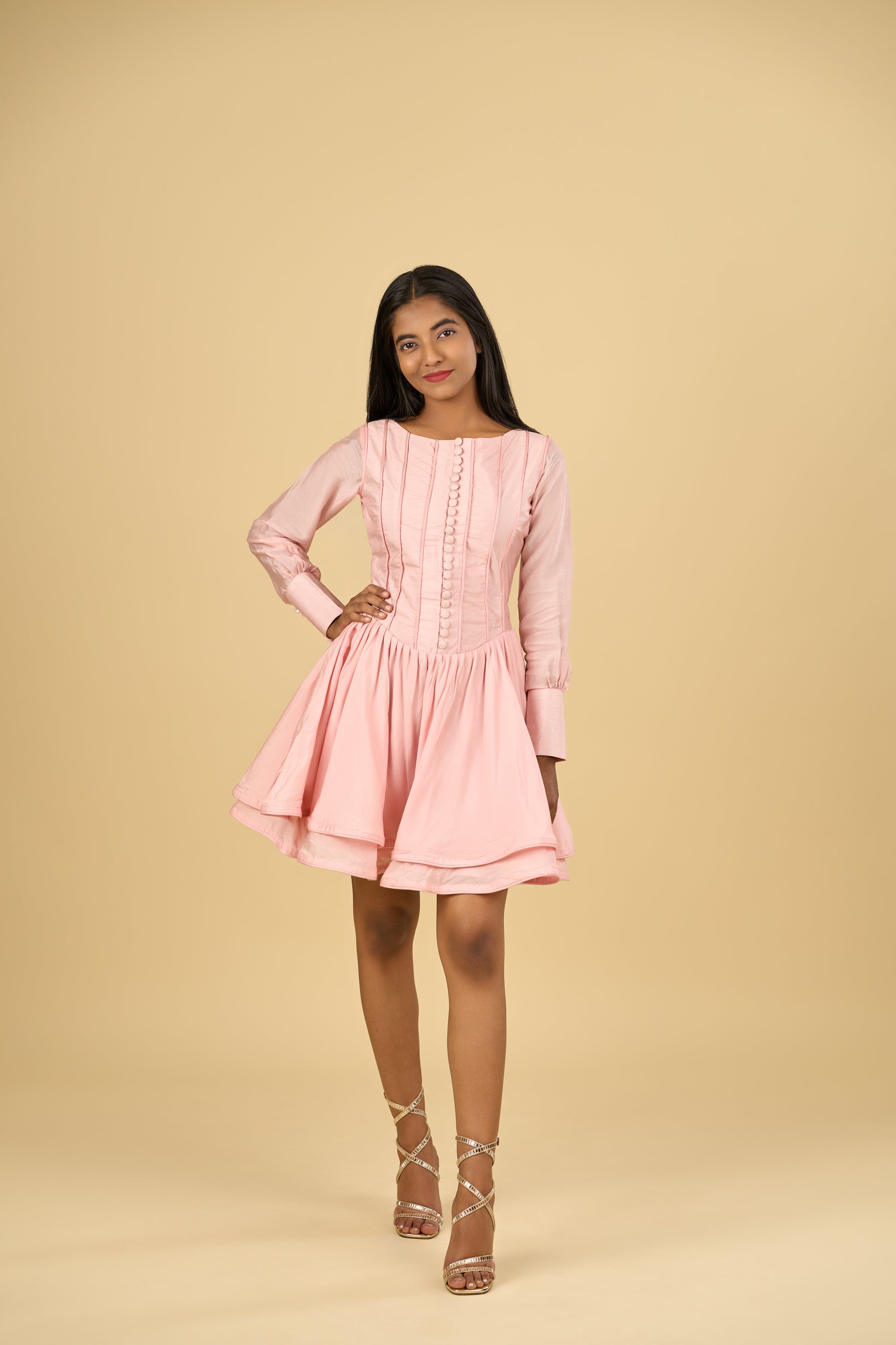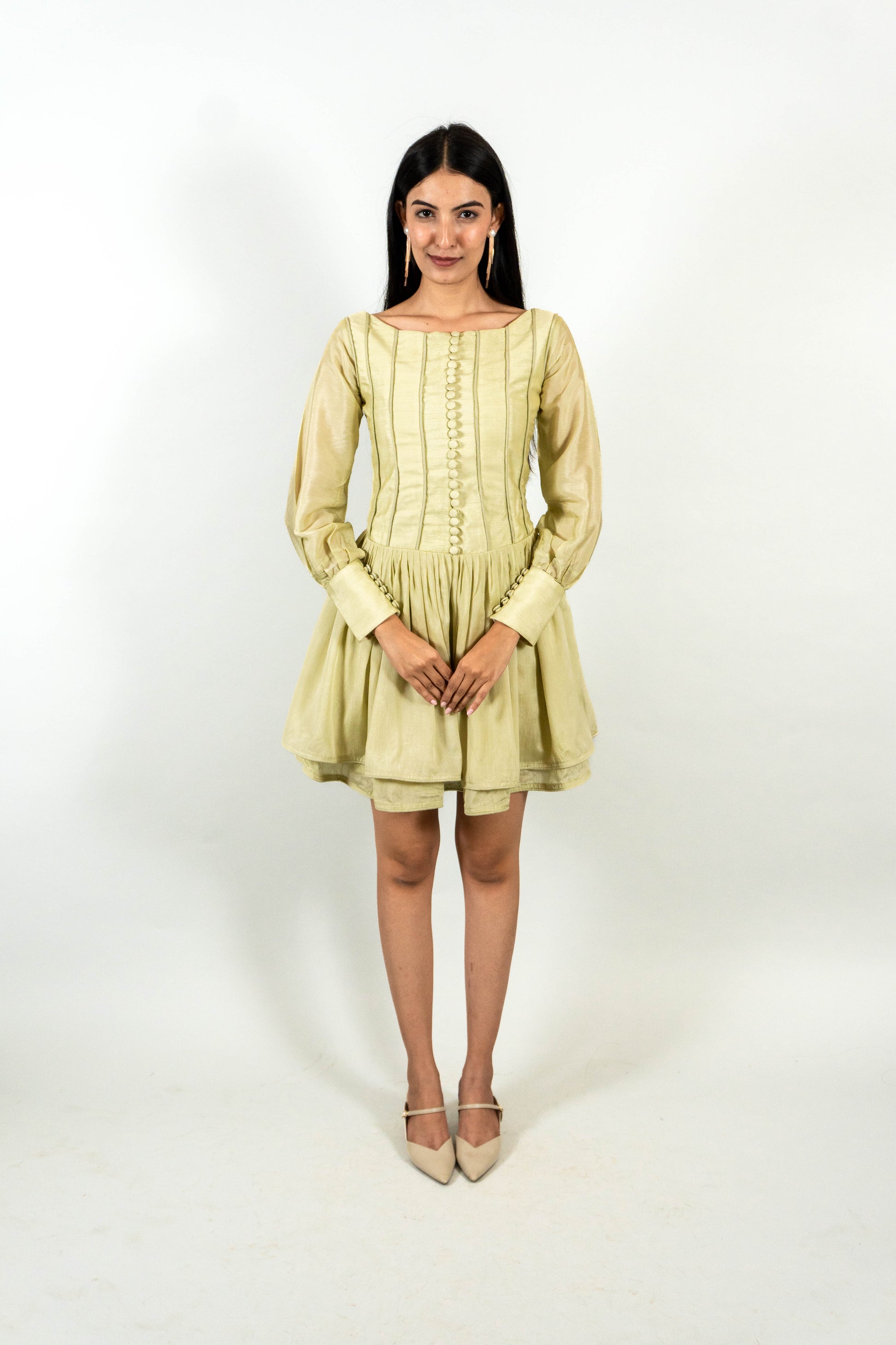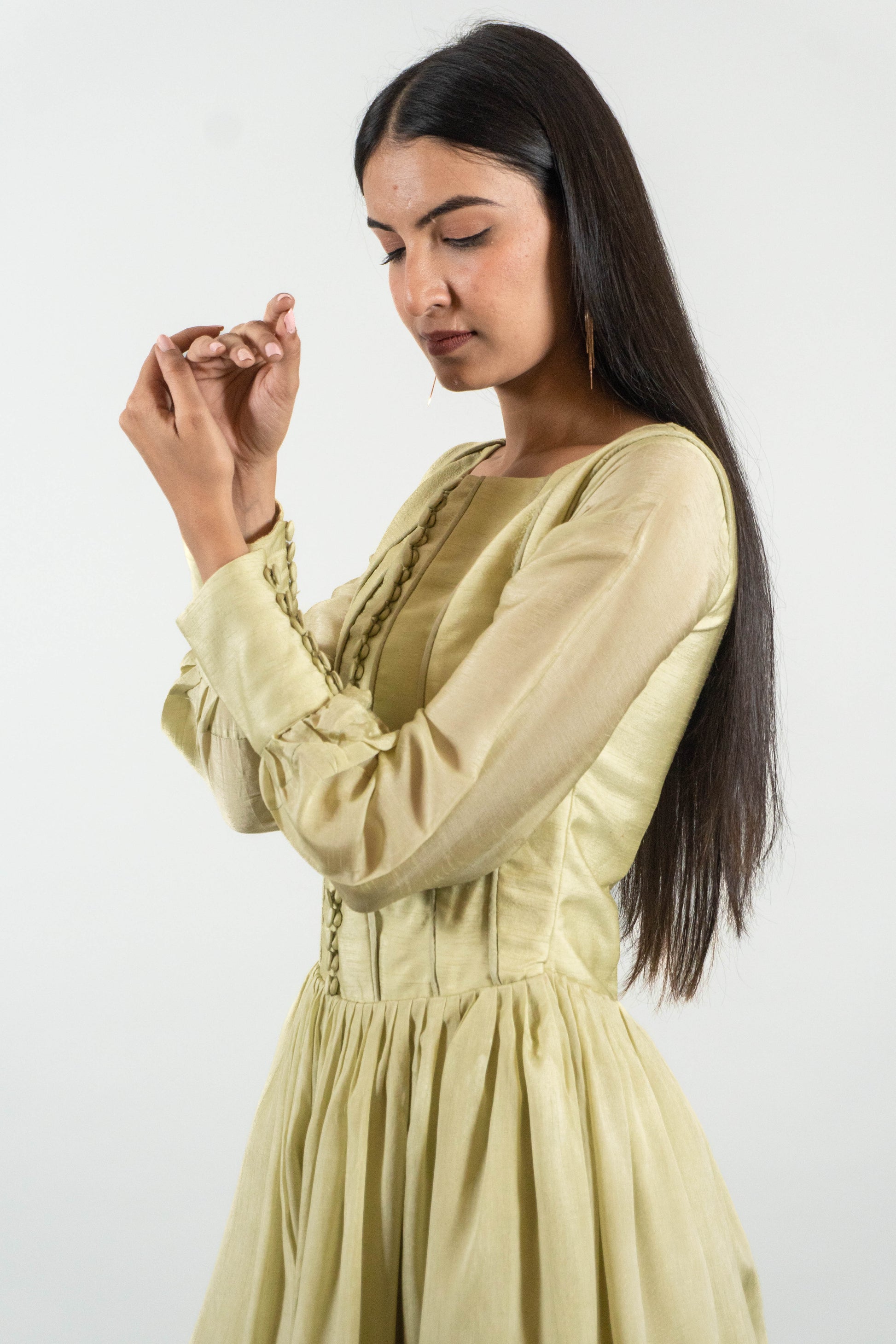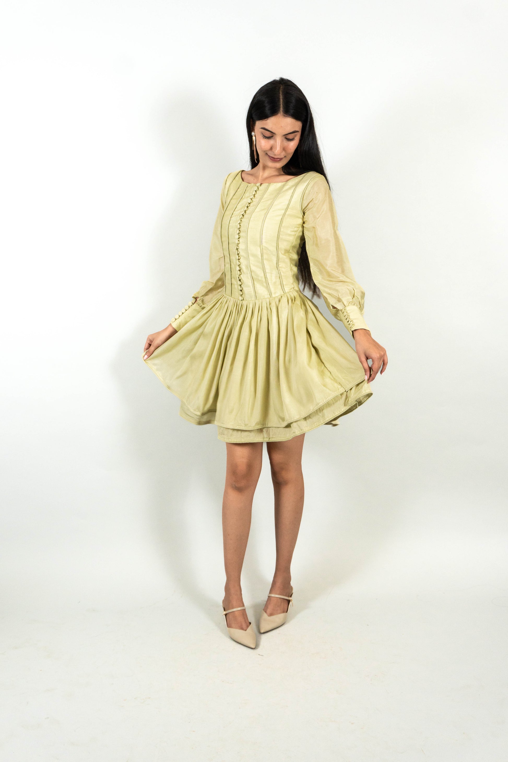 This design features a jewel neckline and intricate piping detailing with vertical pleats for a refined look. Buttons along the bodice add a classic touch, while the layered, flared skirt creates movement.