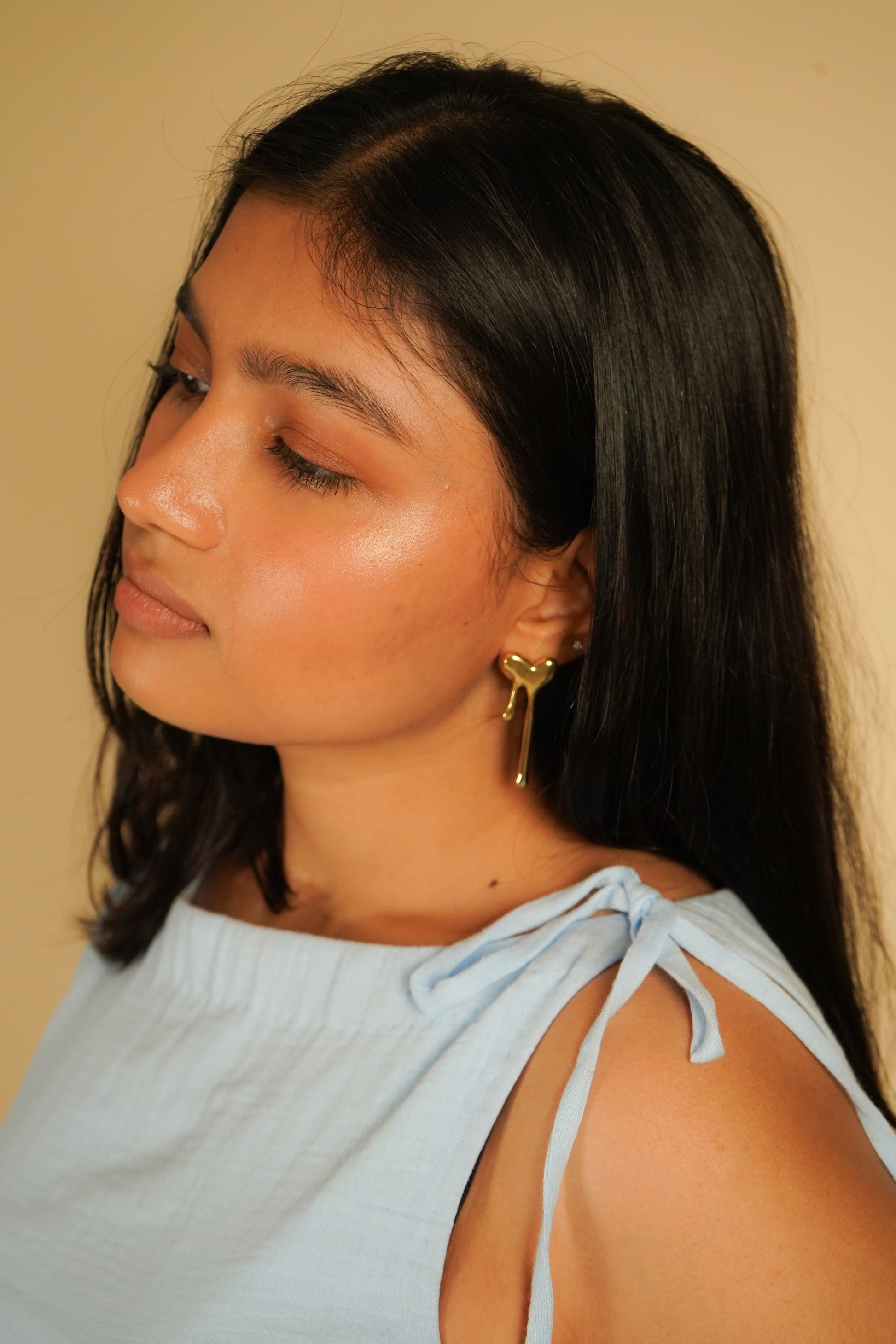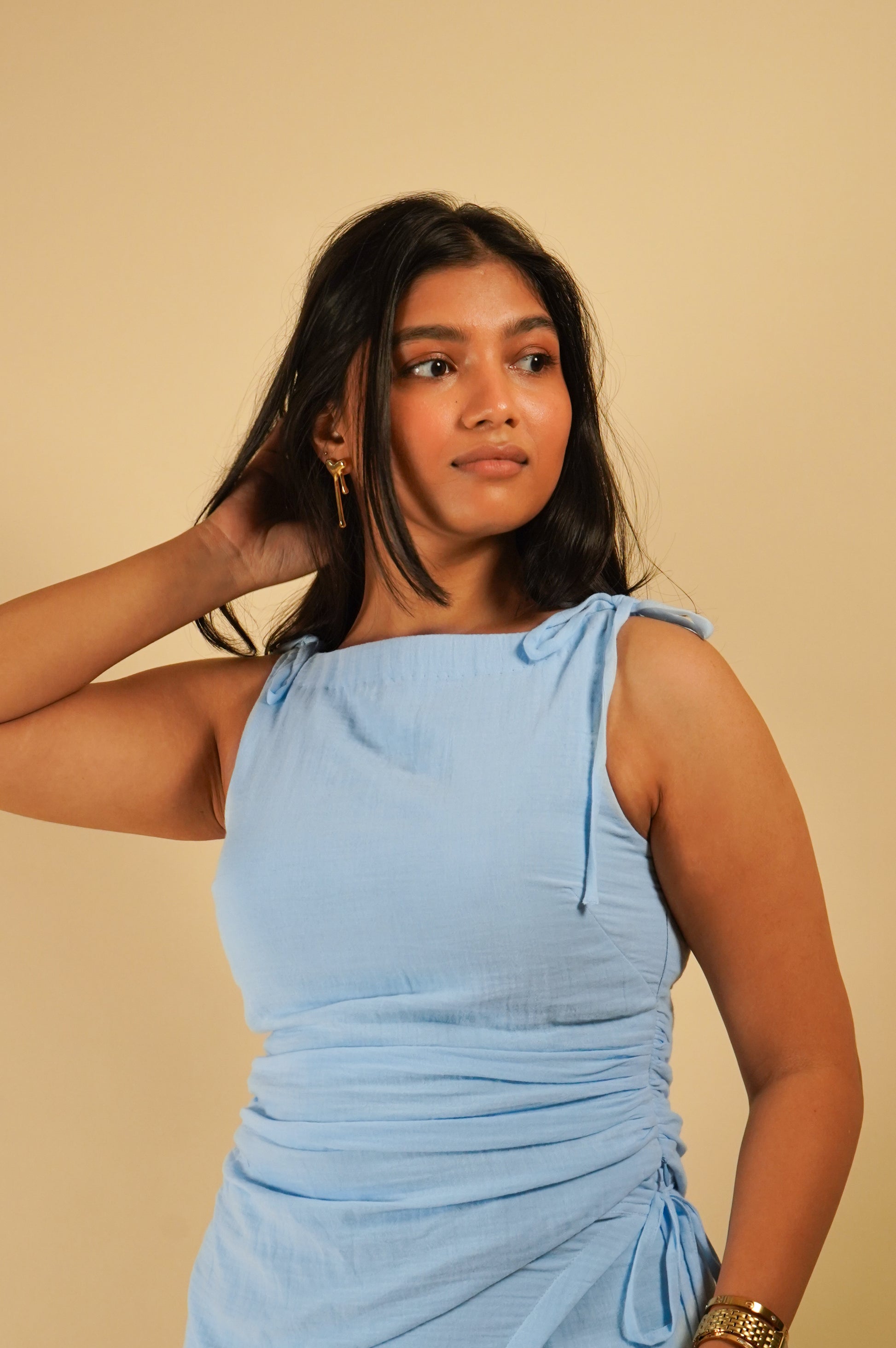 The draped top is a sleeveless, powder blue design featuring soft shoulder tie details that add a delicate, feminine touch. Its subtle ruched waist create a flattering, relaxed silhouette. Made from a lightweight, airy cotton fabric, it blends comfort with elegance.