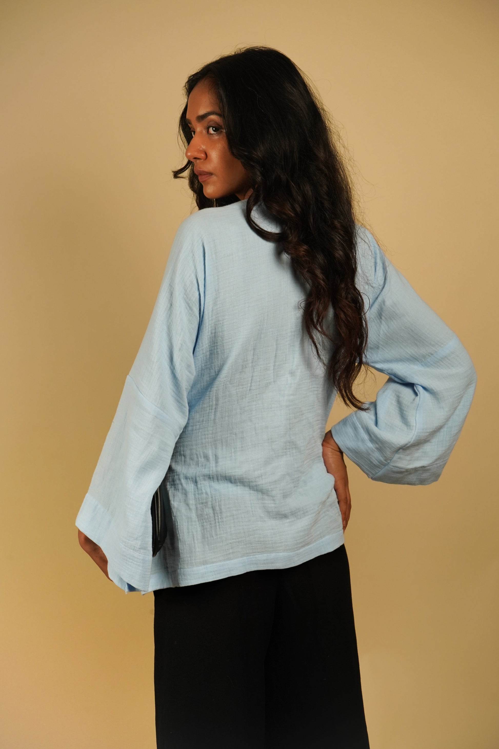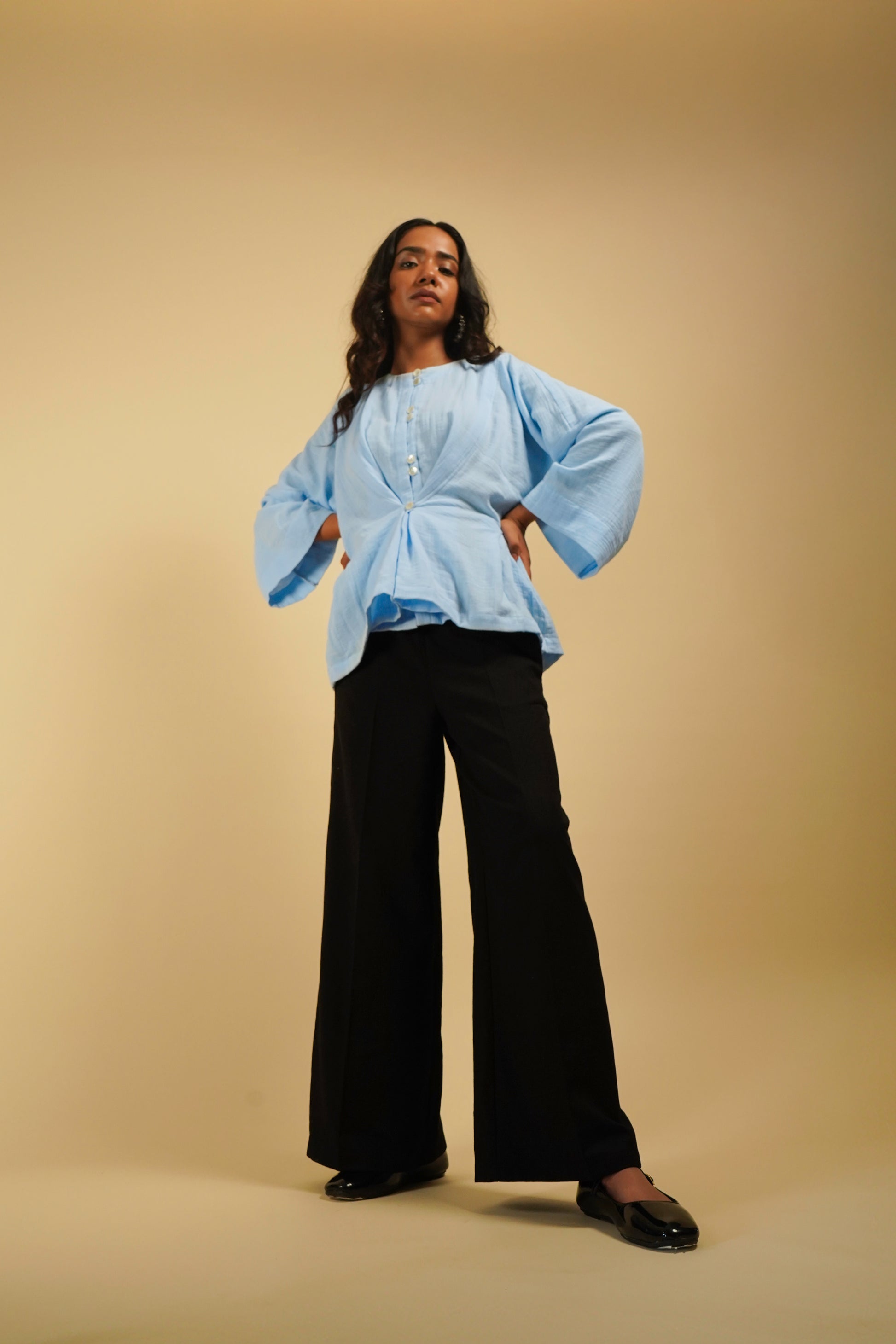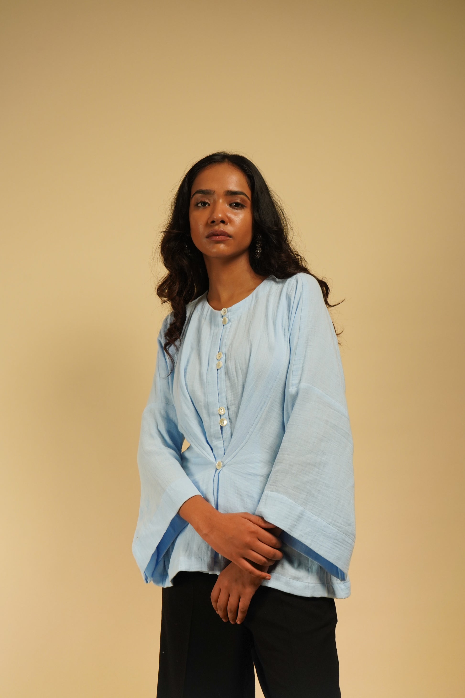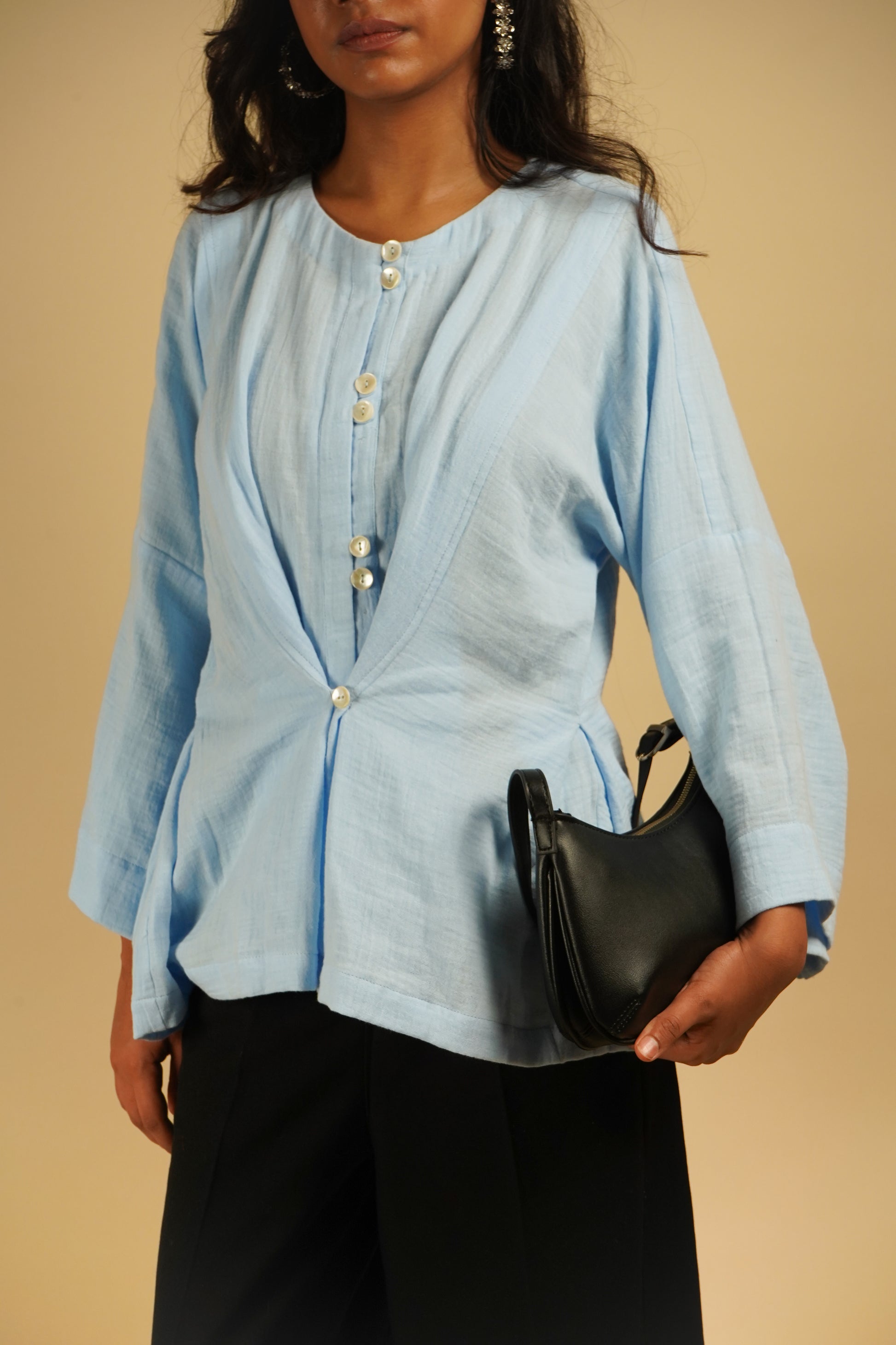 This powder blue top is crafted from soft, breathable double gauze cotton for all-day comfort and ease. Featuring a flattering pleated front with a cinched waist and Mother of Pearl buttons, it blends structure with softness. Perfect for both casual days and outings.