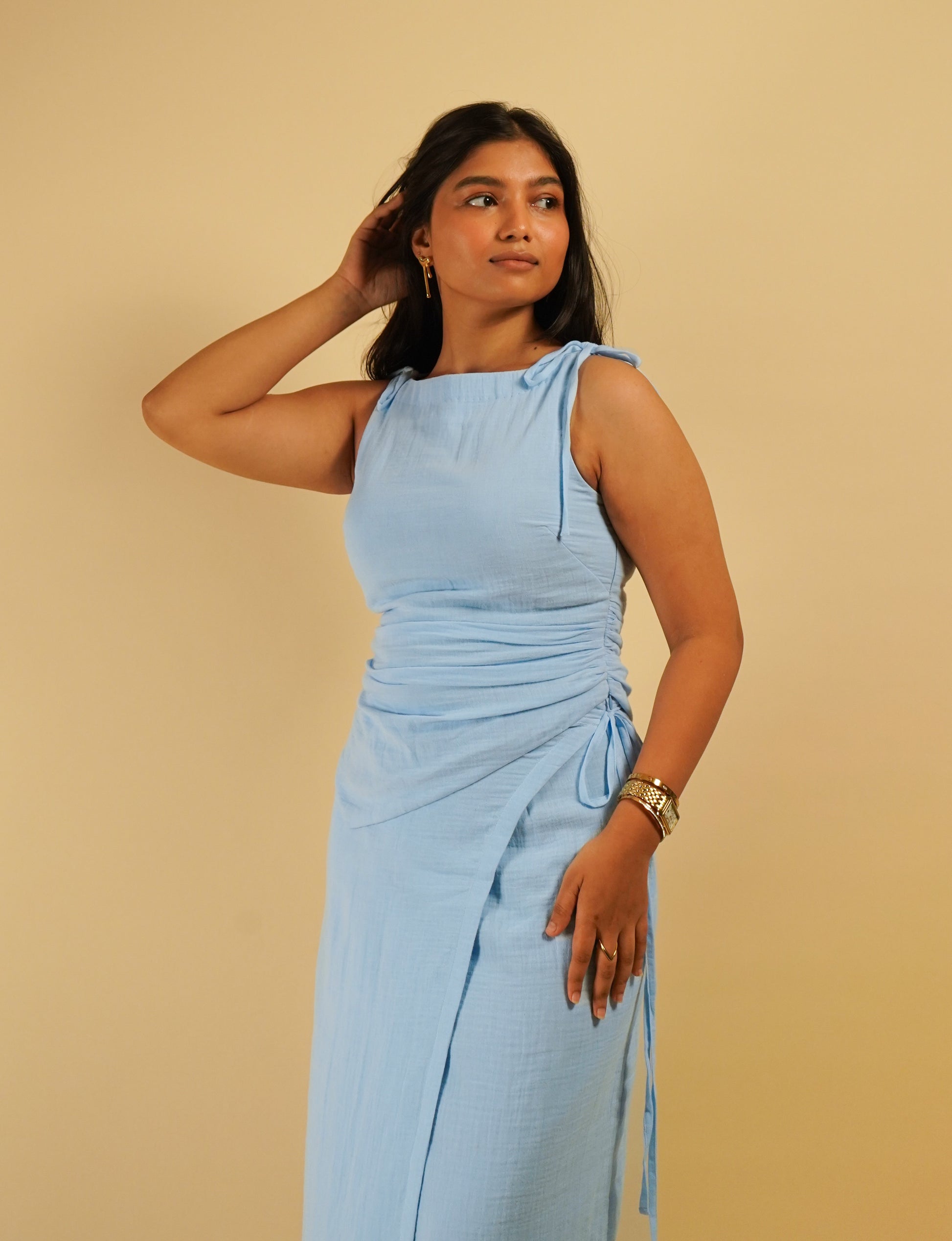 This powder blue wrap-style skirt features a flattering drape and side tie detail, creating a sleek, feminine silhouette. Made from lightweight, breathable cotton fabric, it's perfect for outings and office.