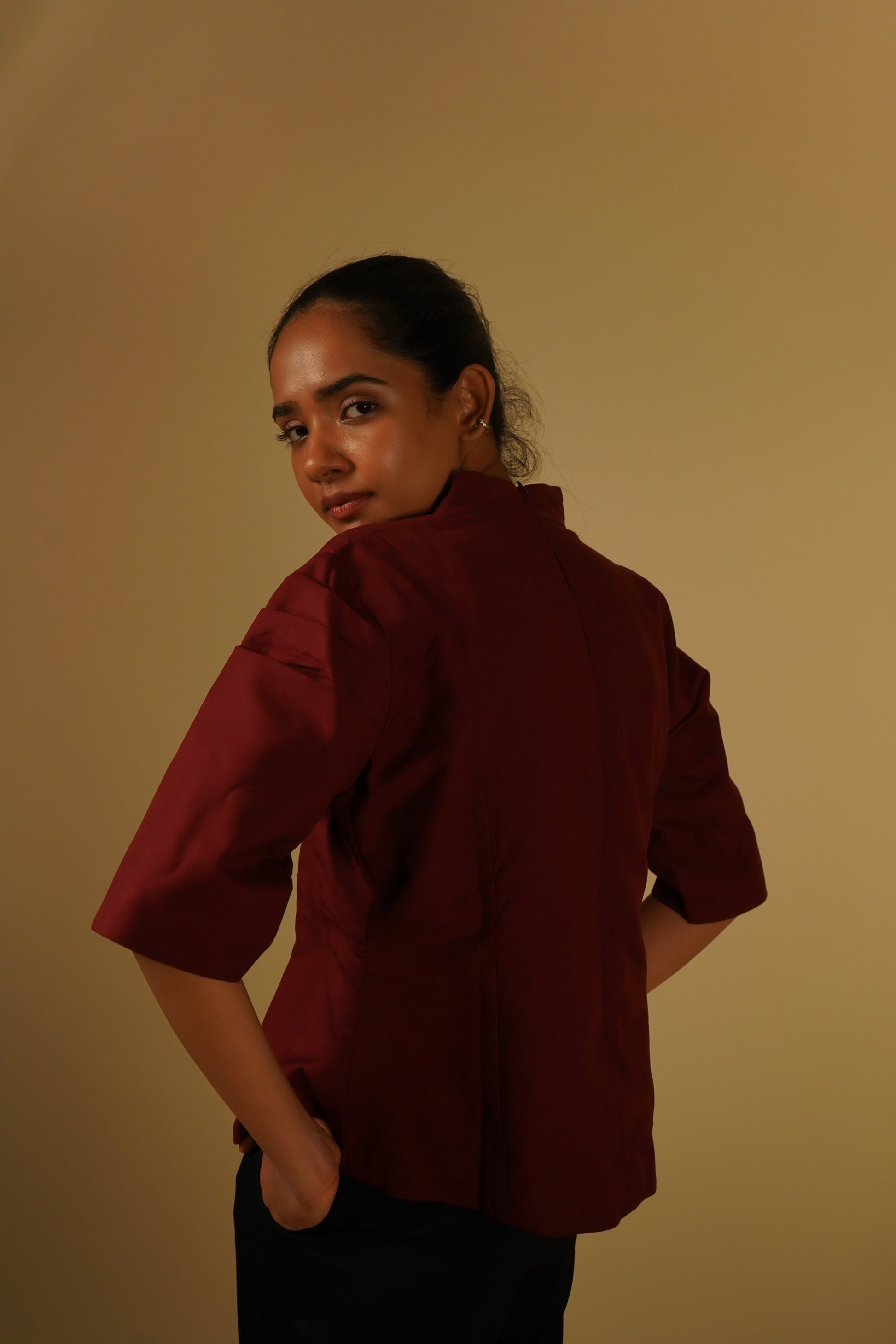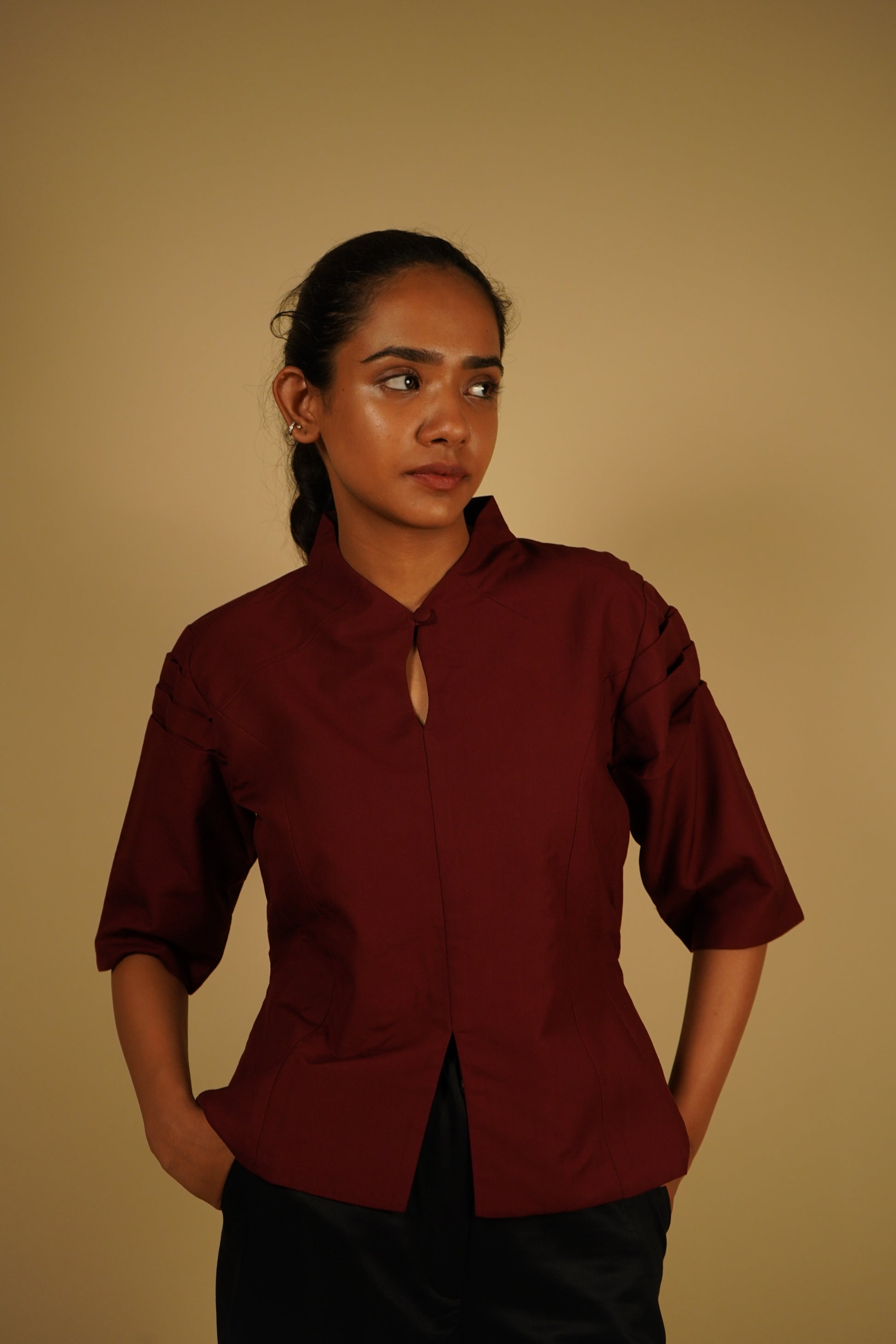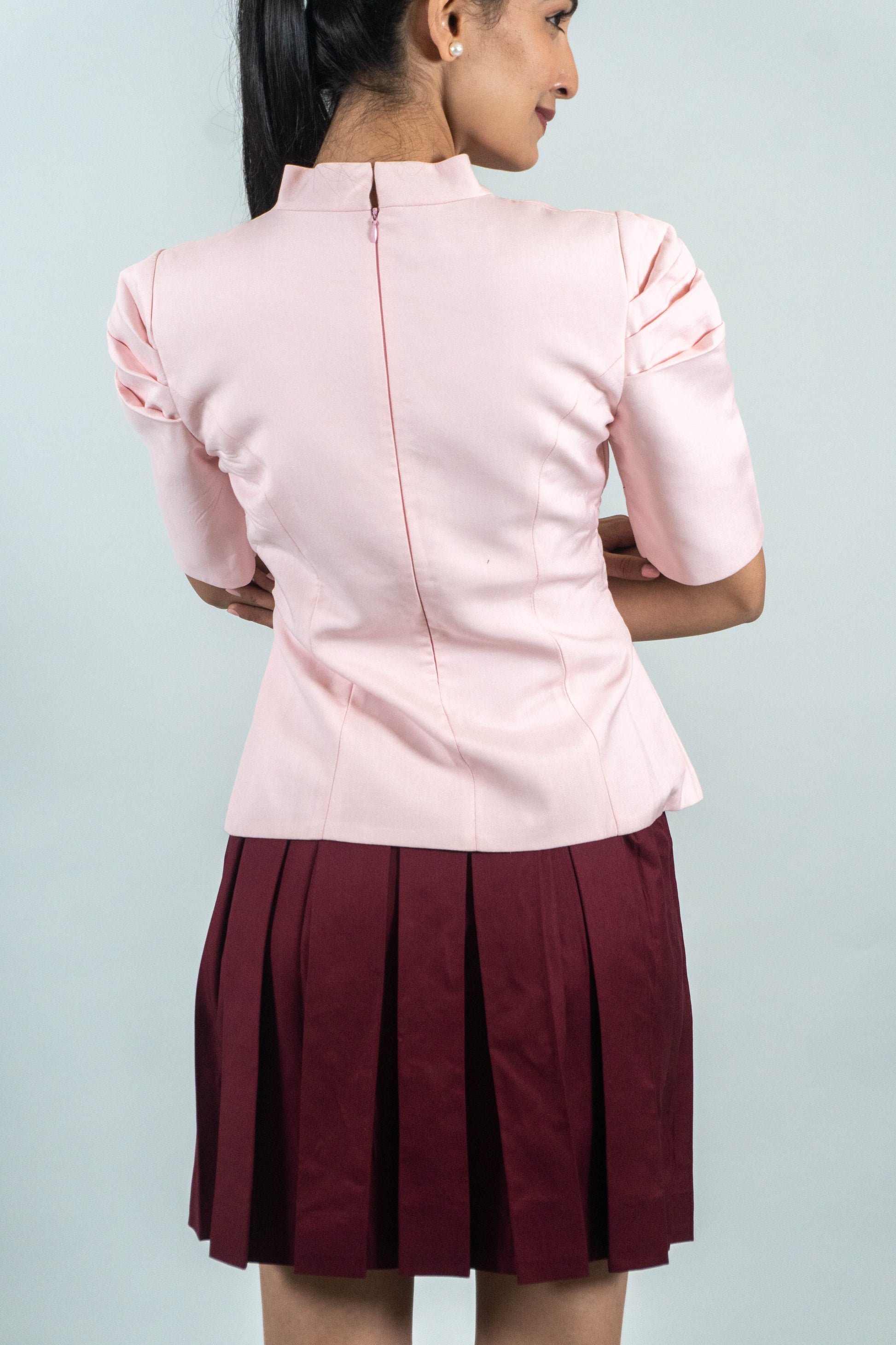 This piece features a high neck and short structured sleeves with pleats at the shoulder for a refined silhouette. Panel detailing offers a contoured fit.