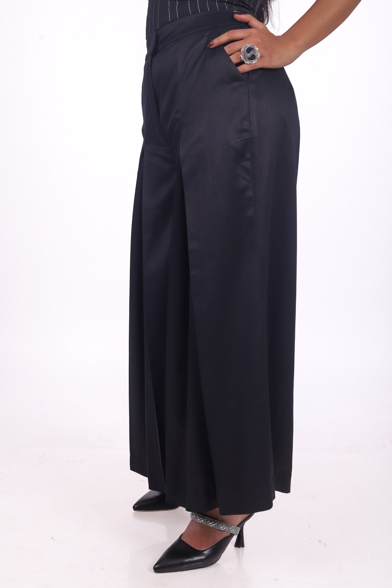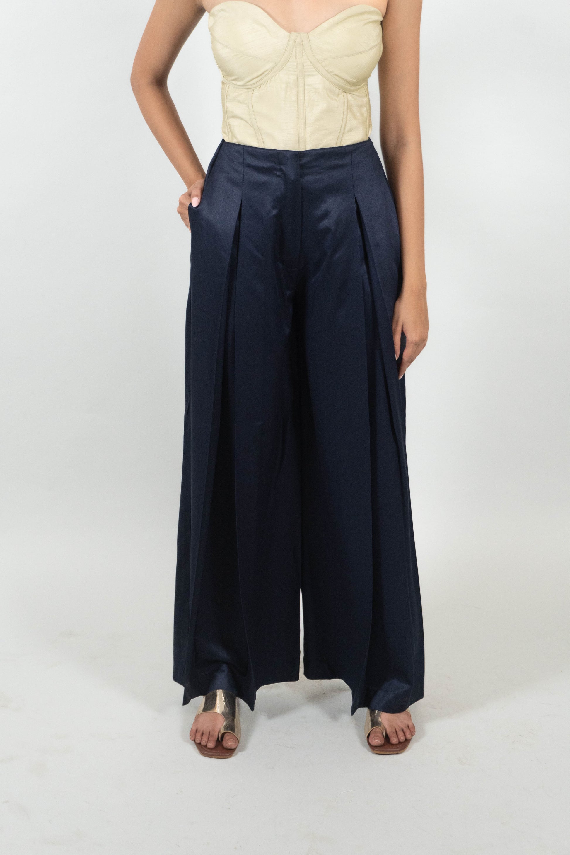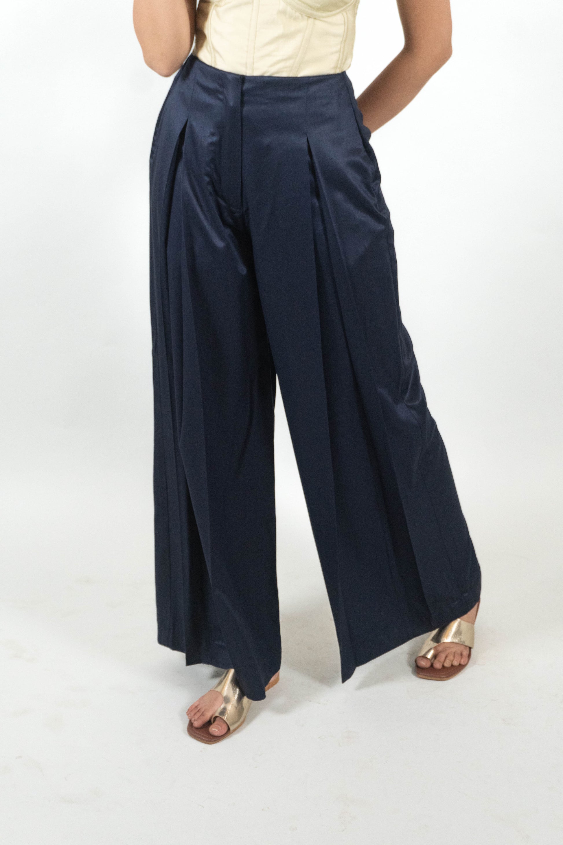 These high-waisted flat-front trousers feature box pleats on the front, creating a structured yet flowy appearance. With side pockets for added functionality, they offer both style and practicality.