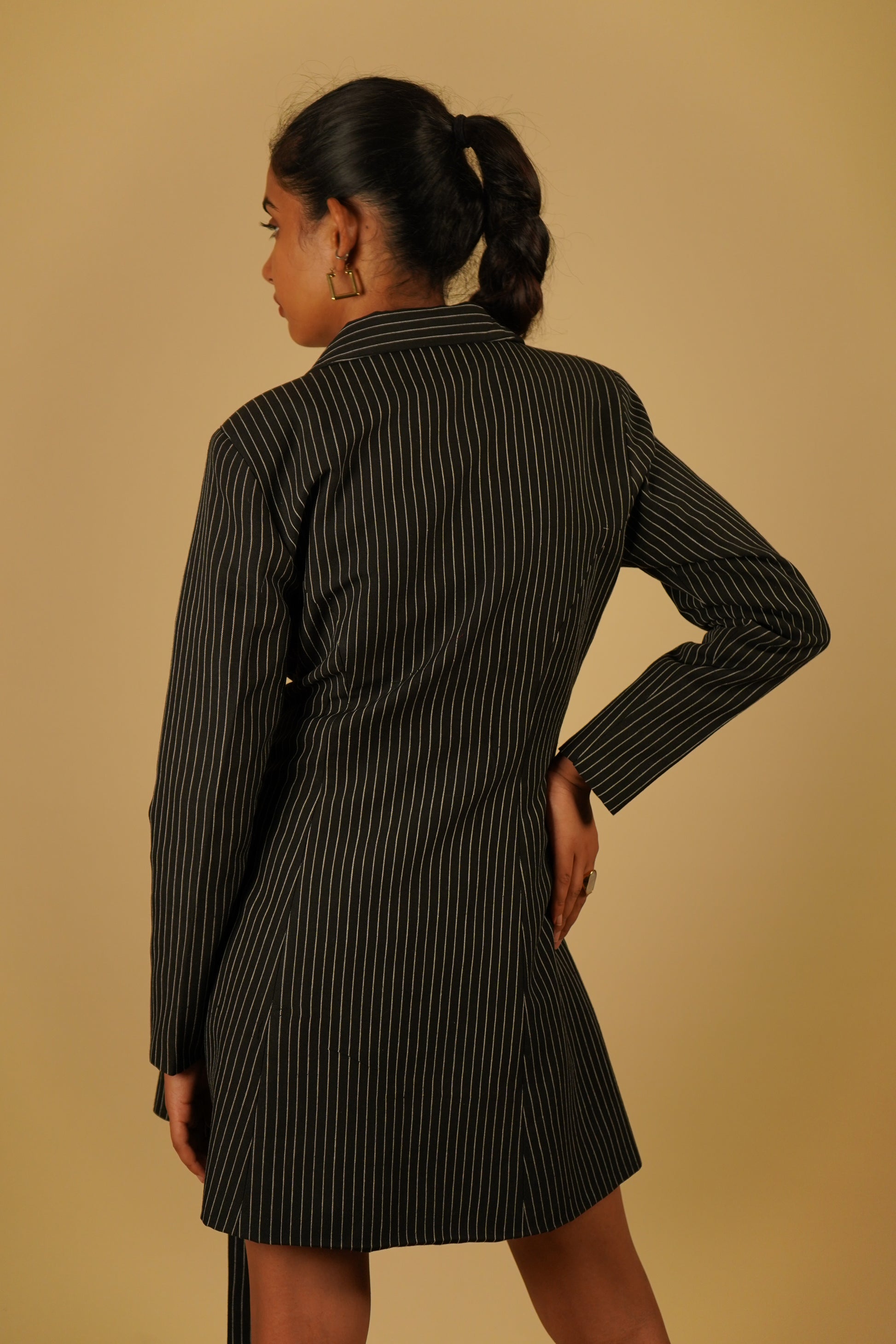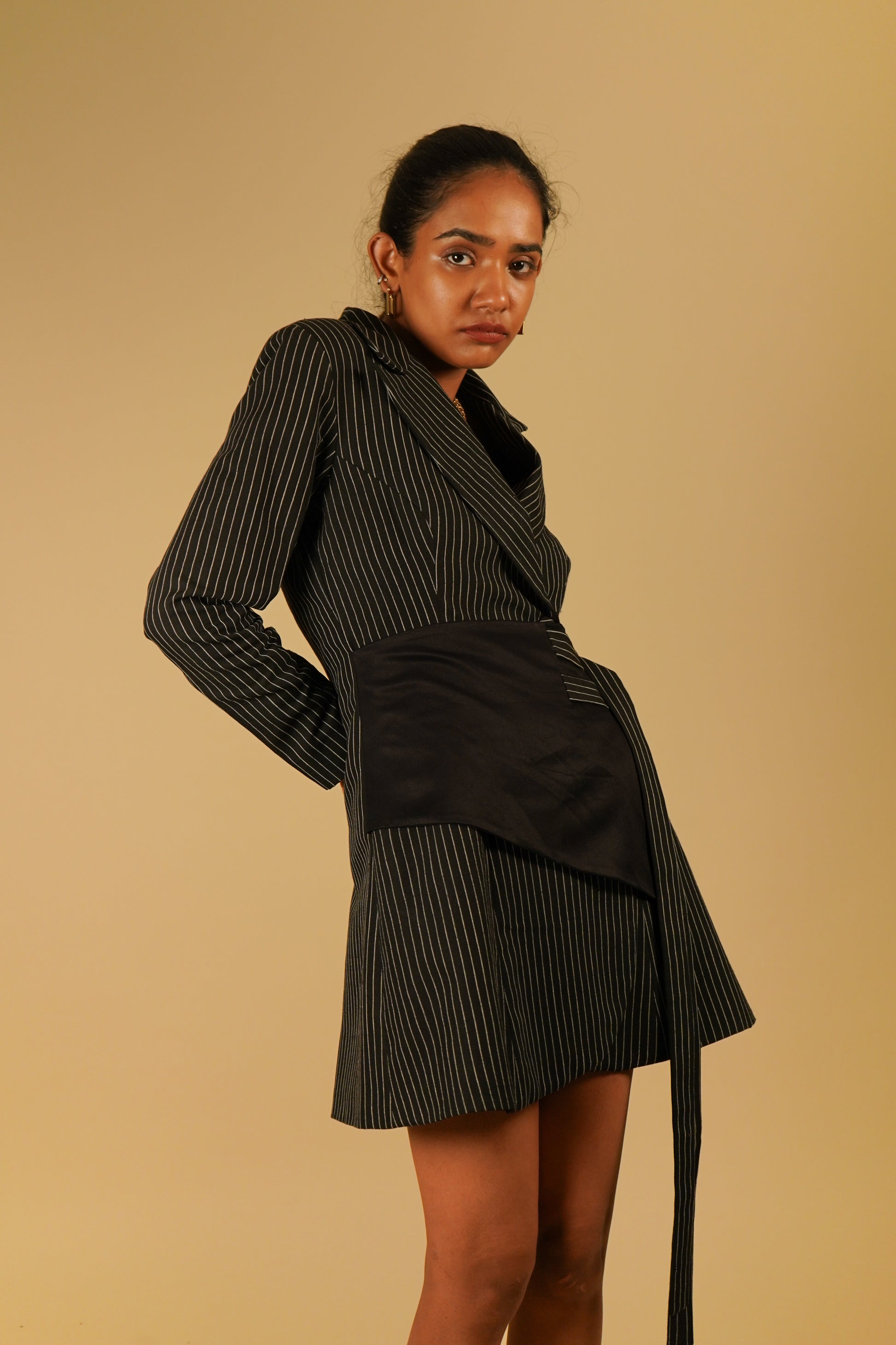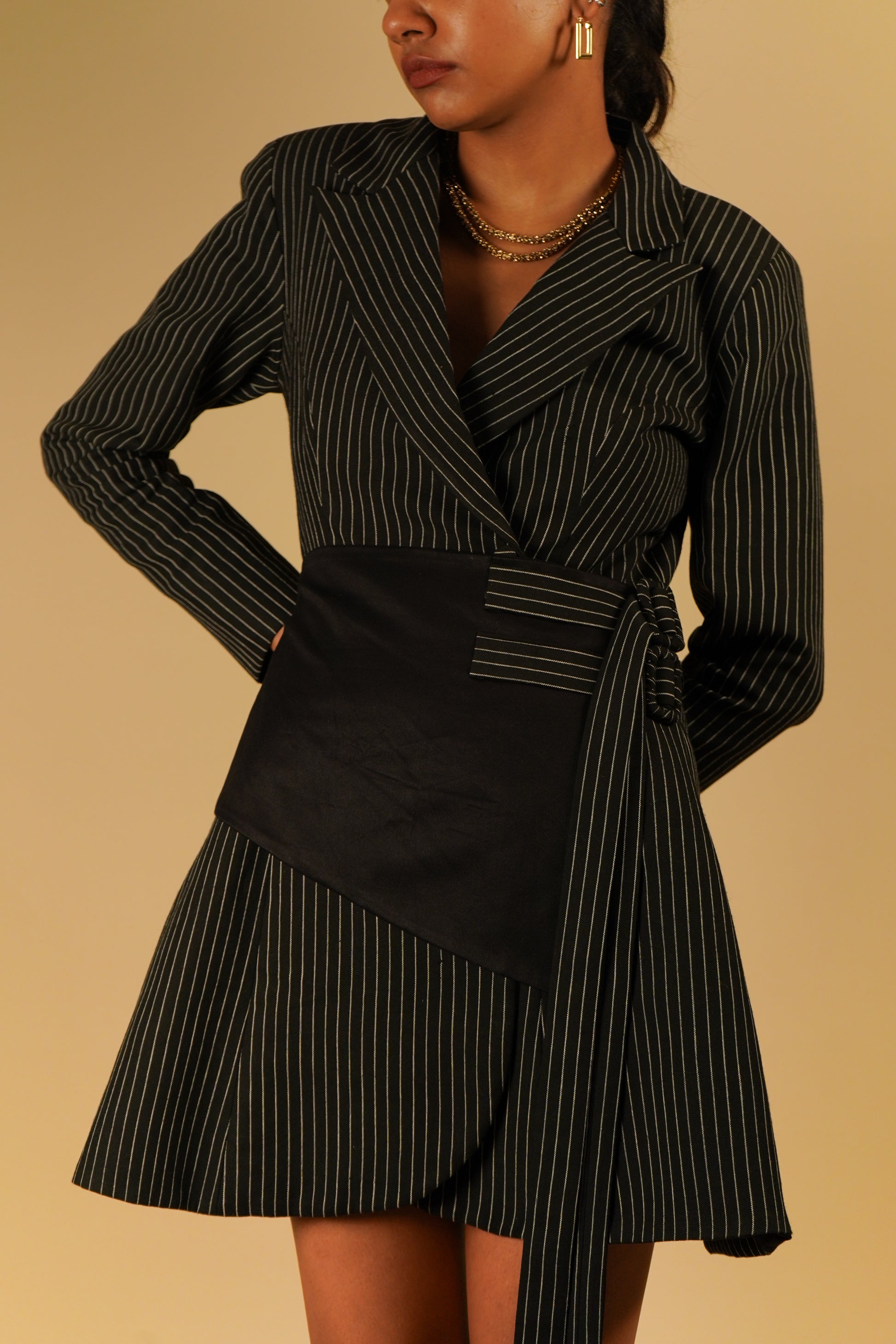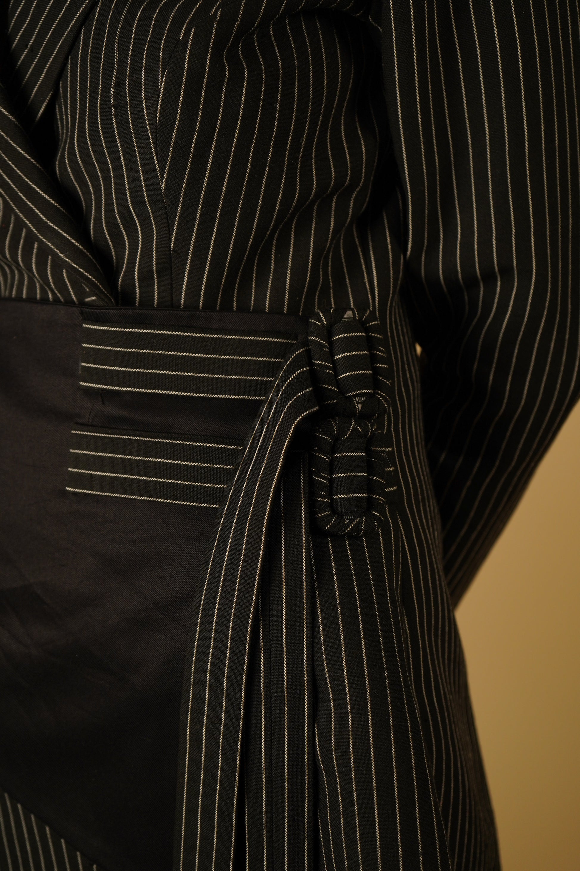 Crafted from 100% handloom cotton, this elegant wrap dress features classic white pinstripe weave on a sleek black base. The tailored silhouette is enhanced by a lapel collar and an asymmetrical front overlap. Perfect for both work and evening wear, it blends structure with effortless style.
