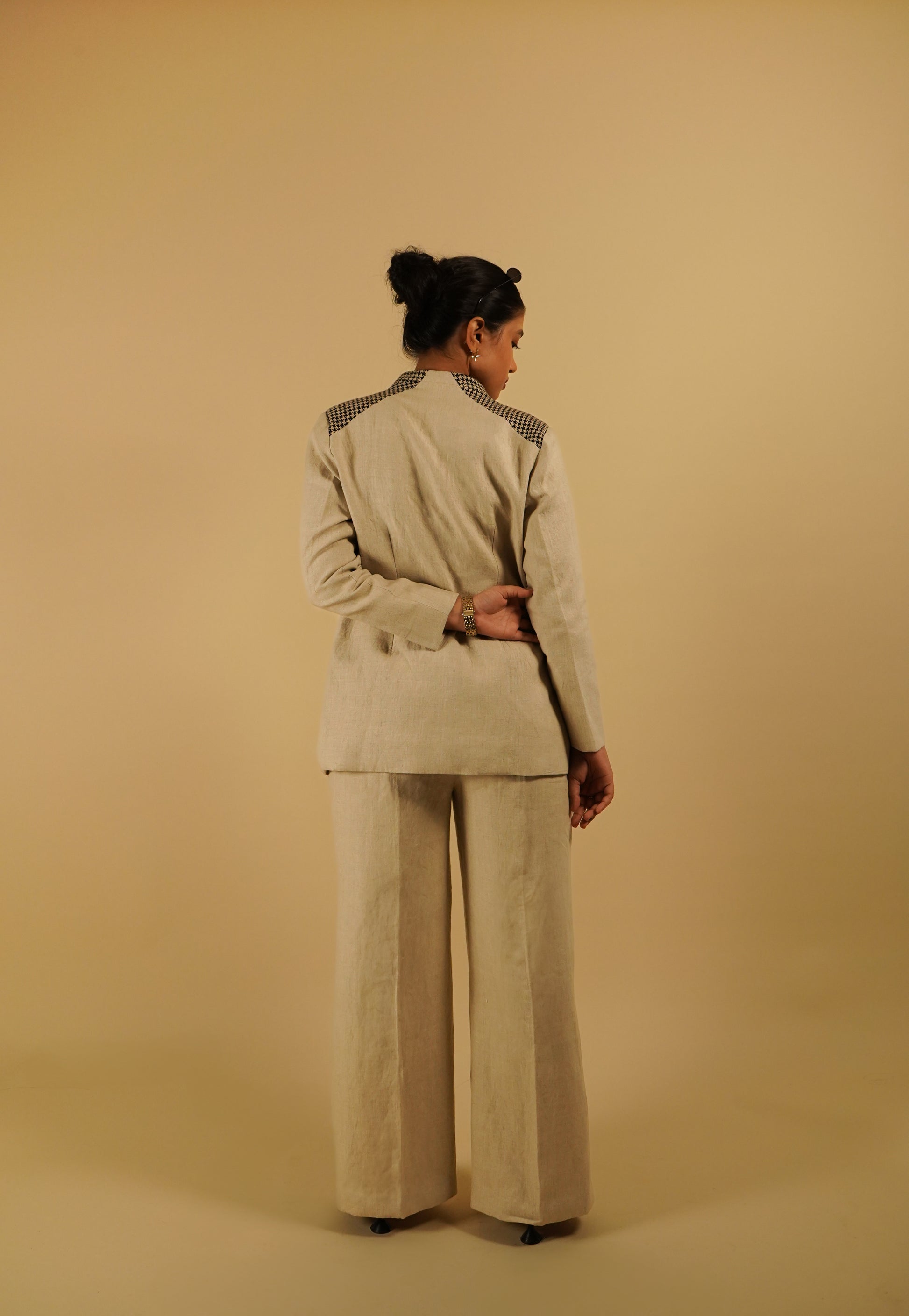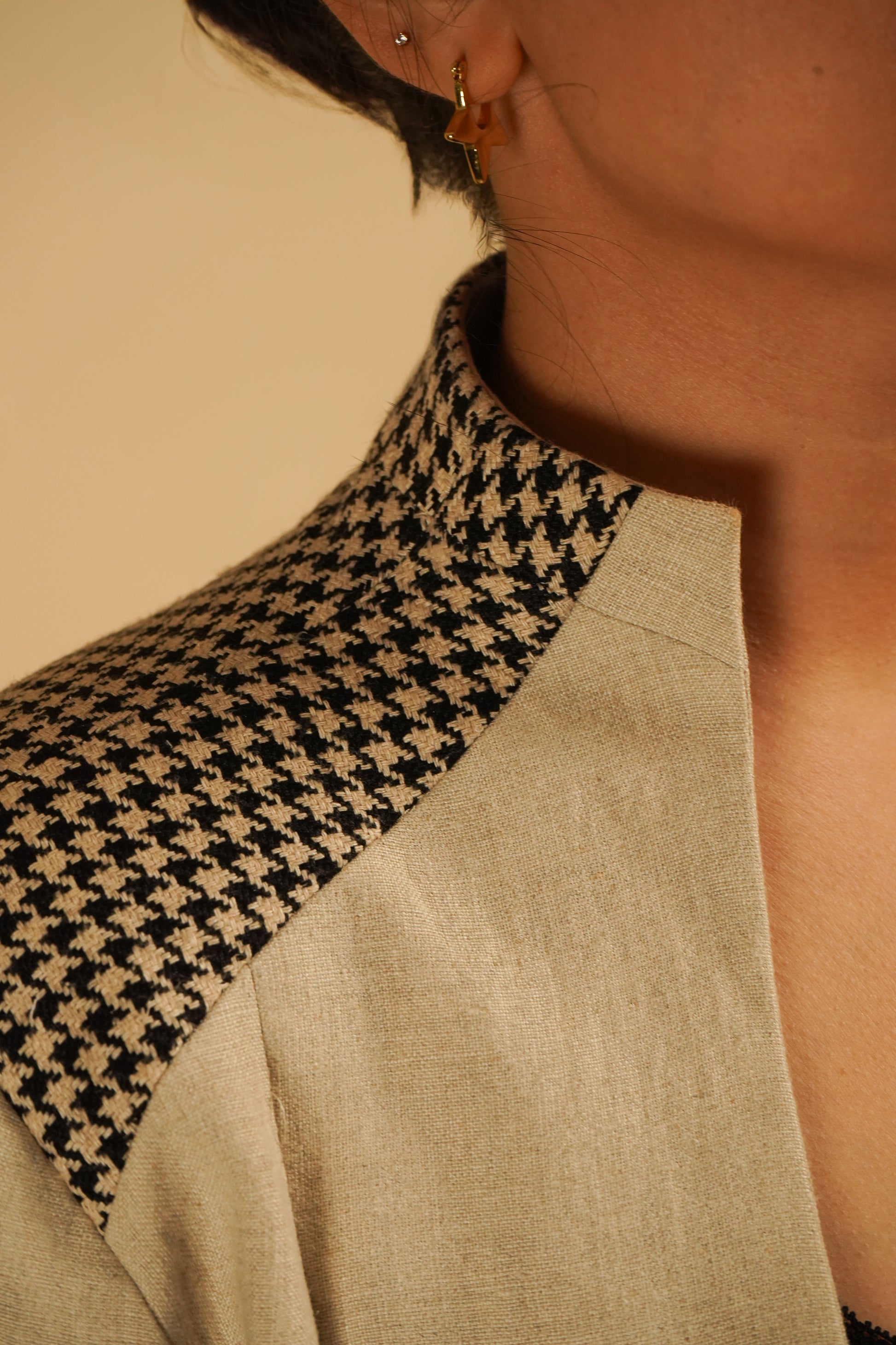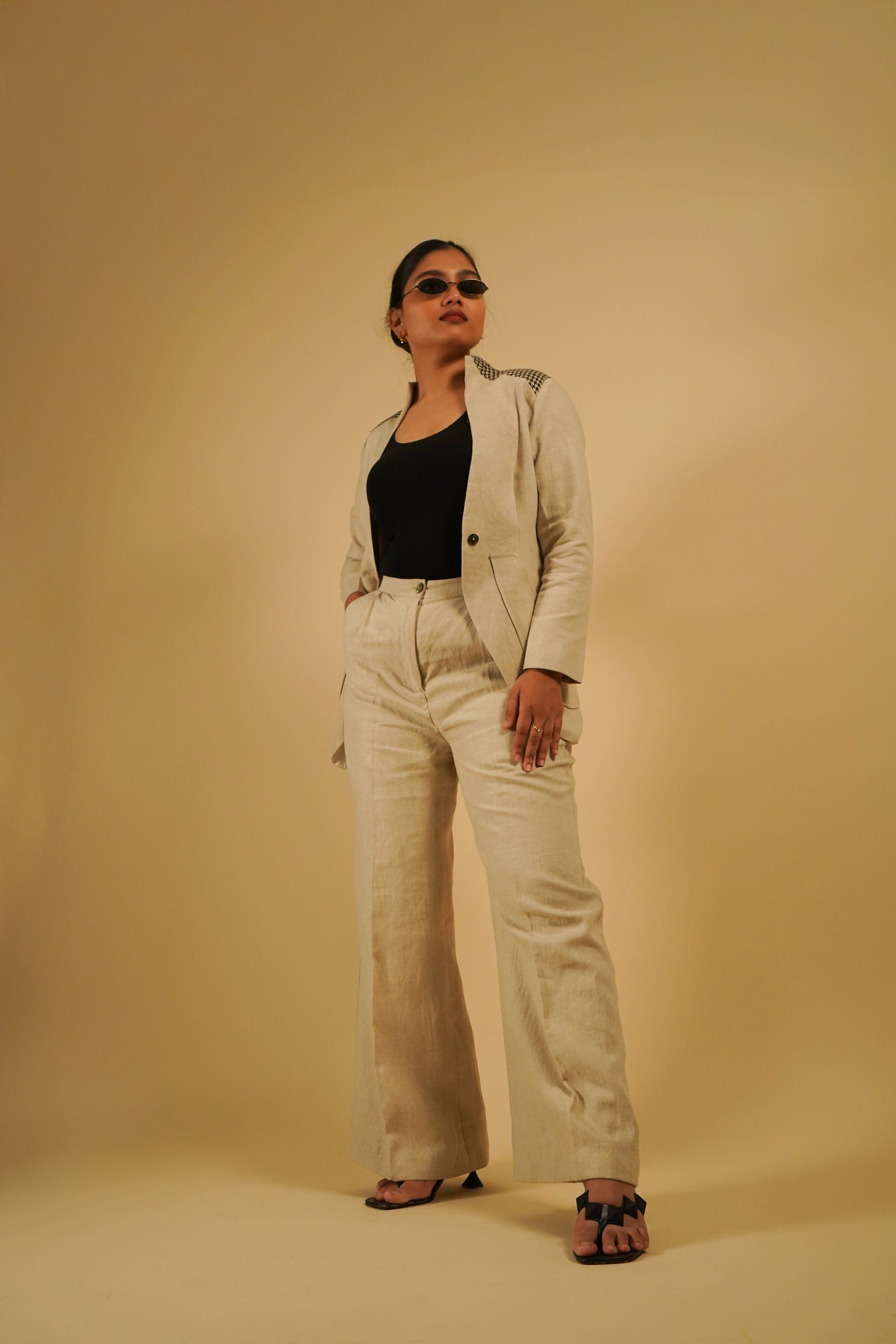 This linen blazer set features a clean, structured silhouette with a modern twist—houndstooth detailing on the shoulders and collar and a wide leg trouser. Made from linen, it's breathable, ideal for layering through seasons. Pair it with our linen trousers or jeans for a sharp, easygoing look.