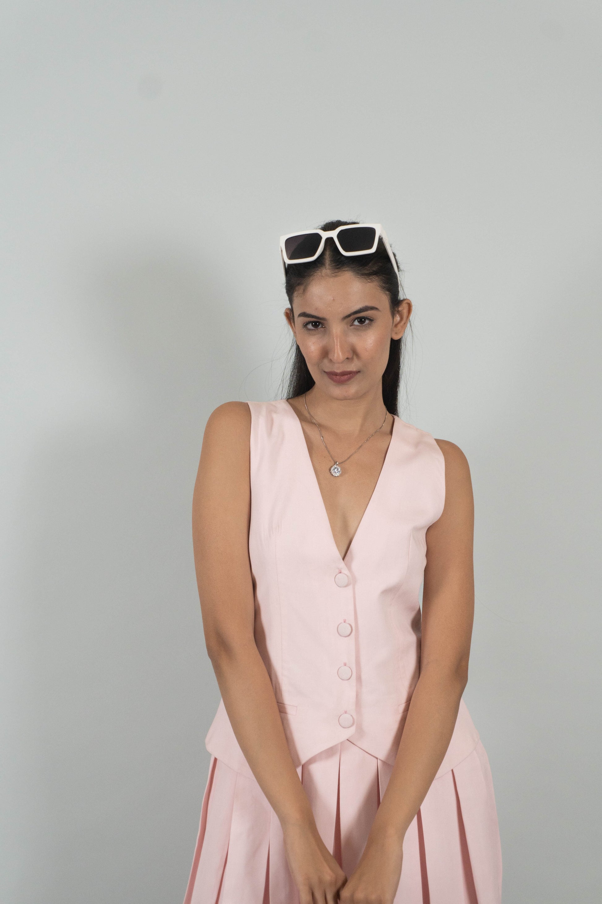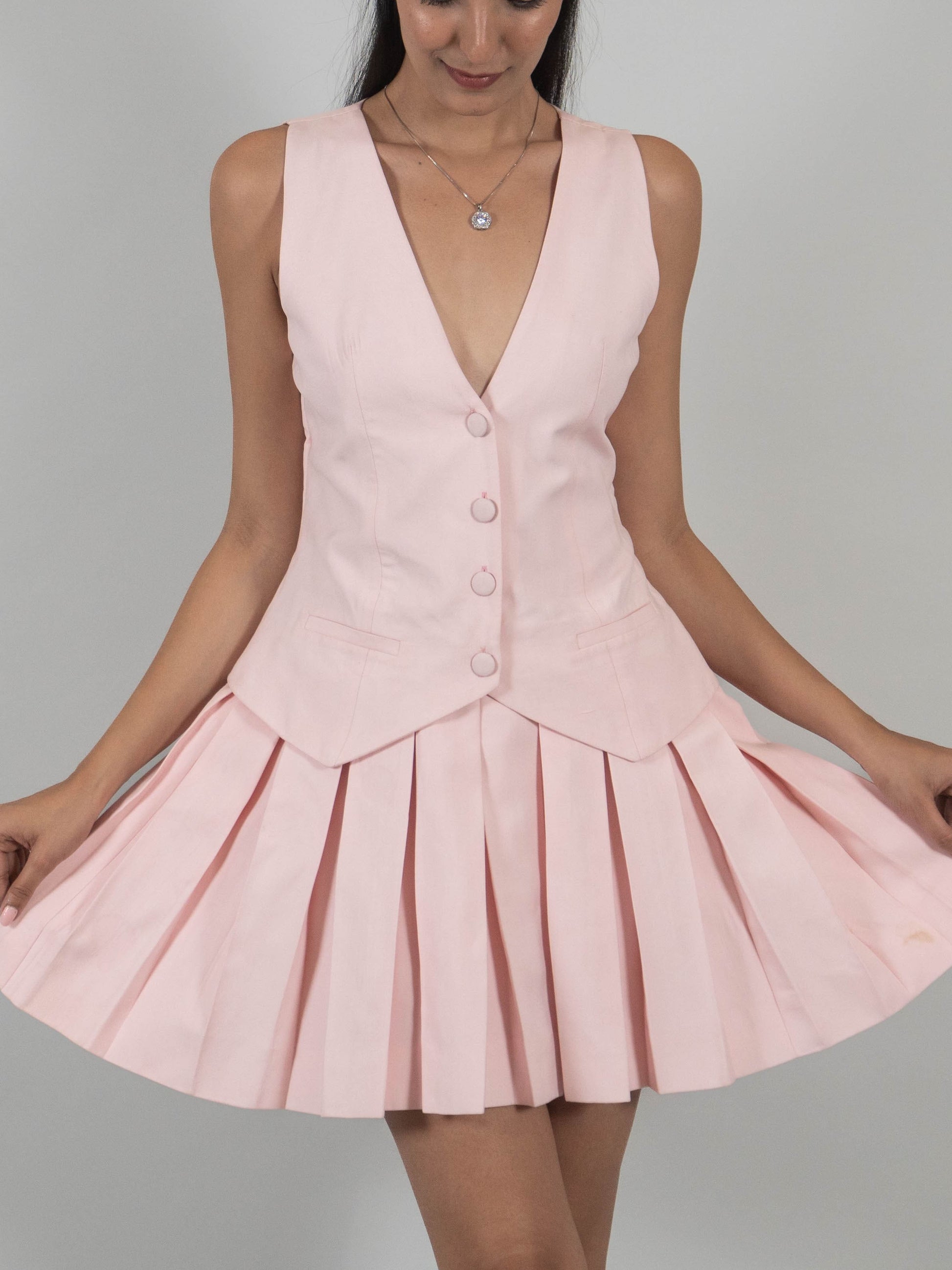 · This sleeveless vest coat dress features collarless design with a single-breasted front for a modern, minimalist look. The pleated bottom adds movement and flair.